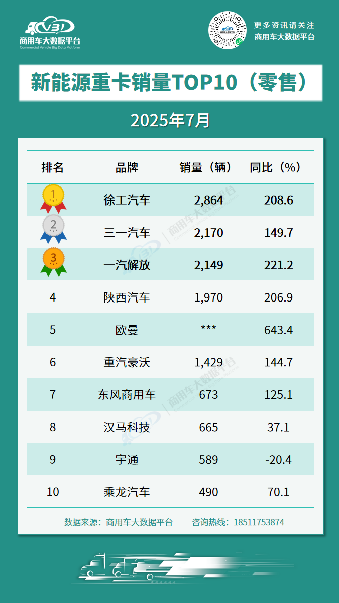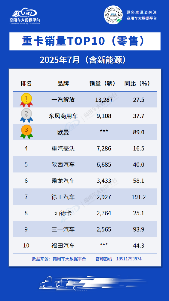 根据商用车大数据平台公布的数据,2025年7月重卡、新能源重卡零售销量TOP10品牌为: