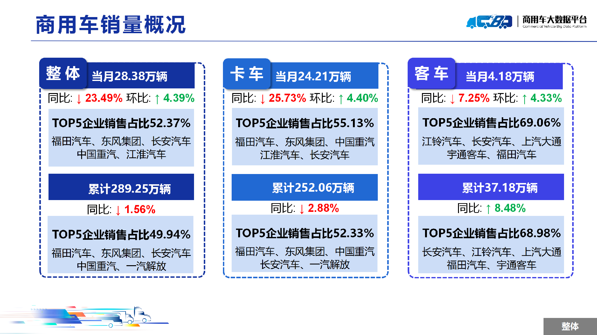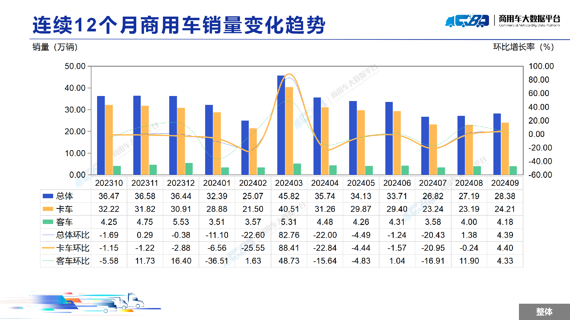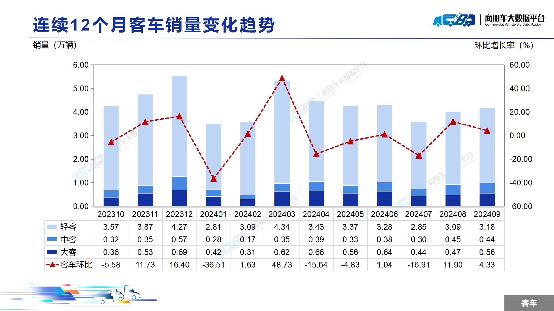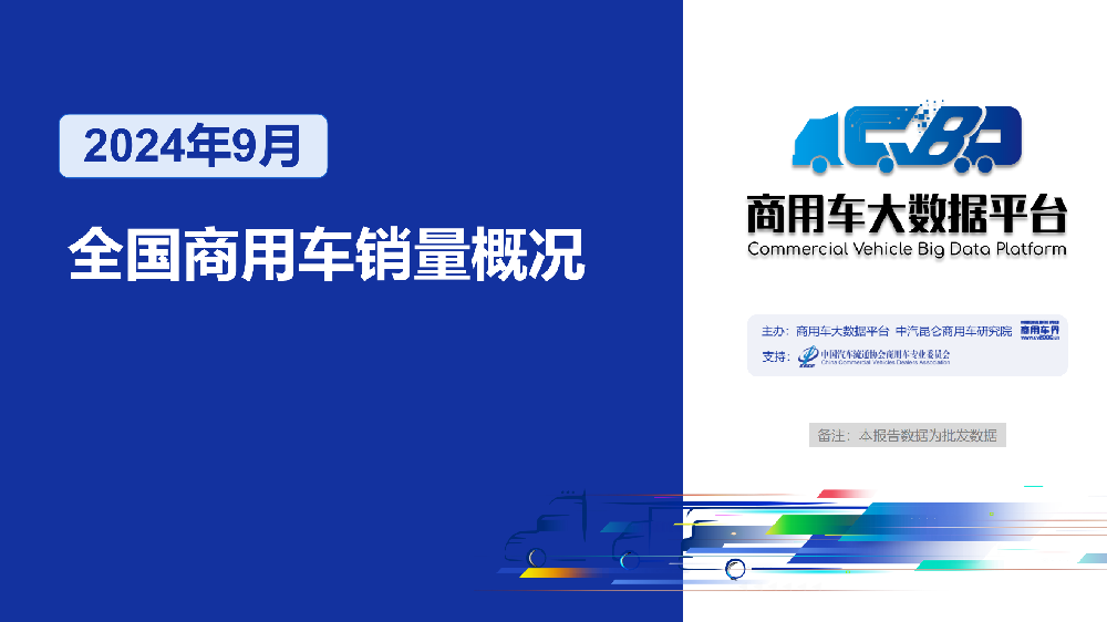 2024年1-9月全国商用车累计销量(批发)为289.25万辆,同比下降1.56%。其中卡车累计销量为252.06万辆,同比下降2.88%;客车累计销量为37.18万辆,同比上涨8.48%。