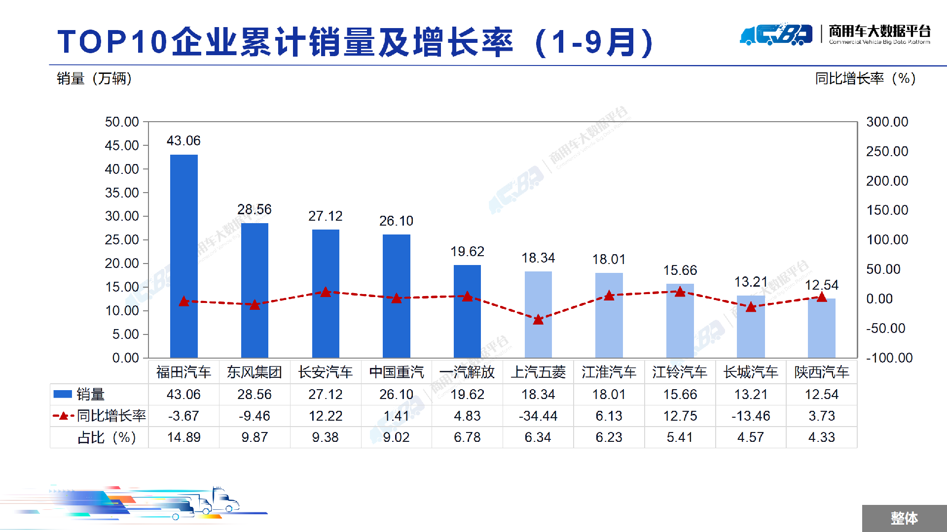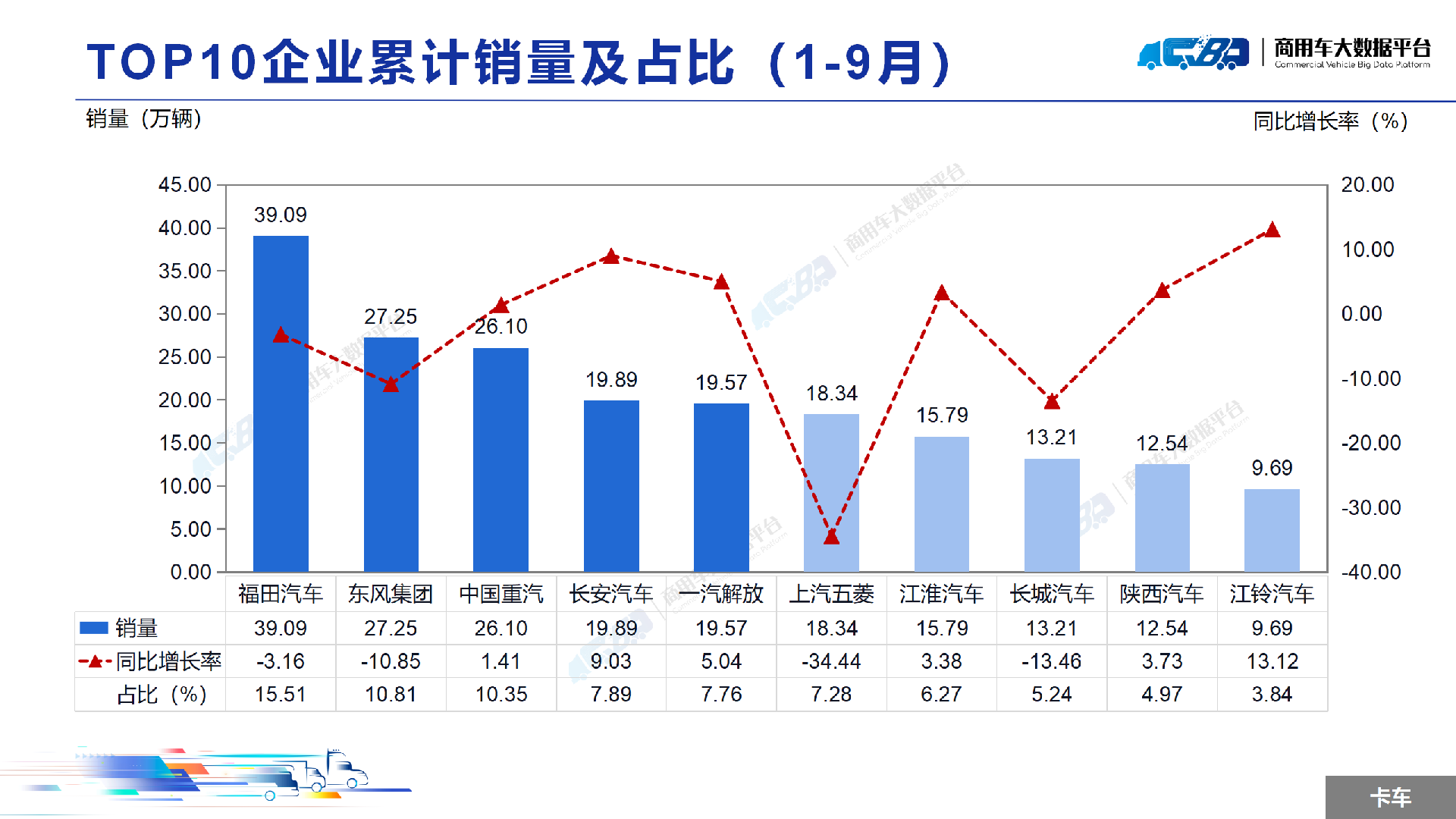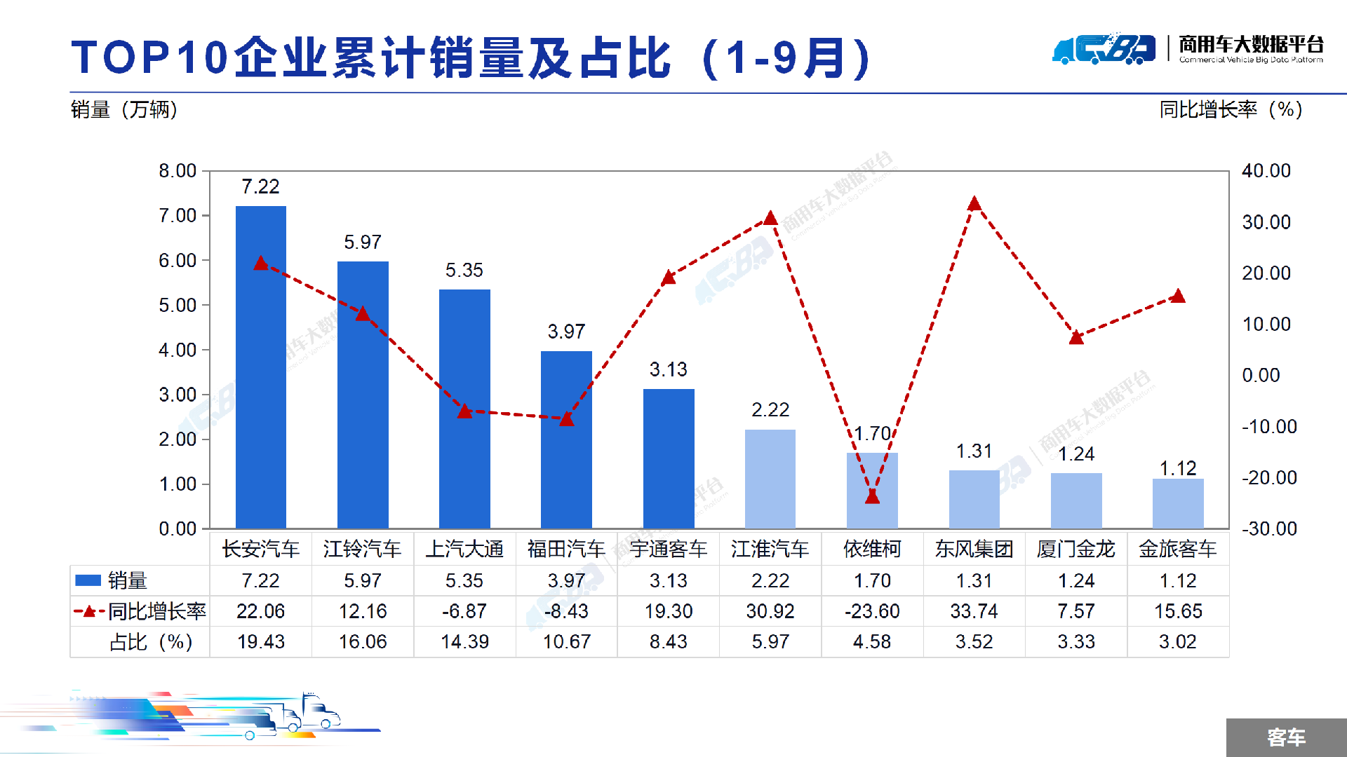2024年1-9月全国商用车累计销量(批发)为289.25万辆,同比下降1.56%。其中卡车累计销量为252.06万辆,同比下降2.88%;客车累计销量为37.18万辆,同比上涨8.48%。