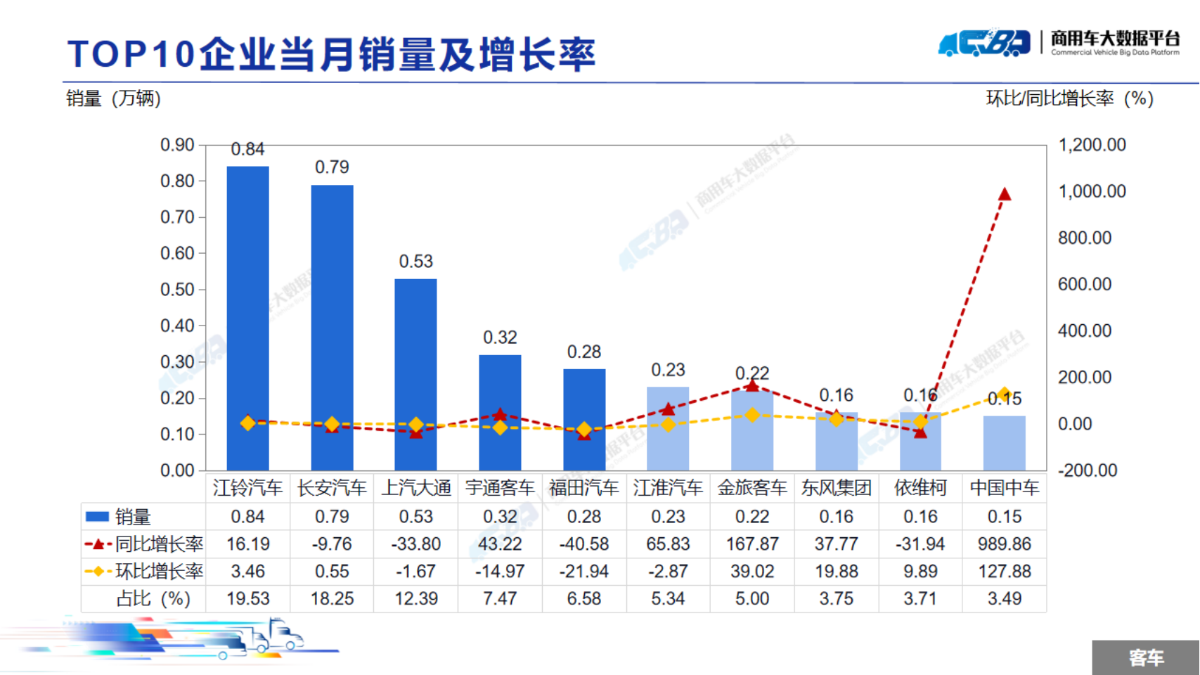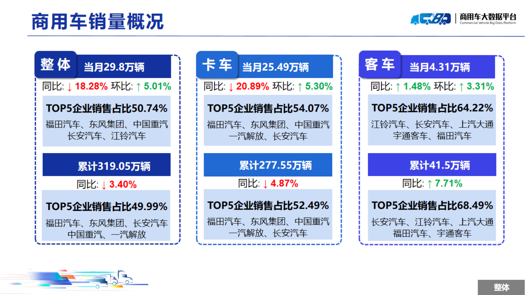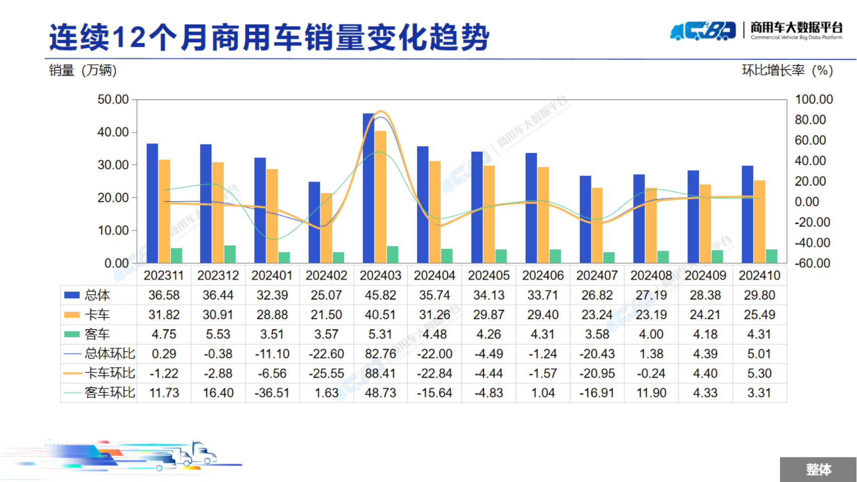 2024年10月全国商用车整体销量(批发)为29.8万辆,同比下降18.28%,环比上涨5.01%。其中卡车销量为25.49万辆,同比下降20.89%,环比上涨5.30%;客车销量为4.31万辆,同比上涨1.48%,环比上涨3.31%。