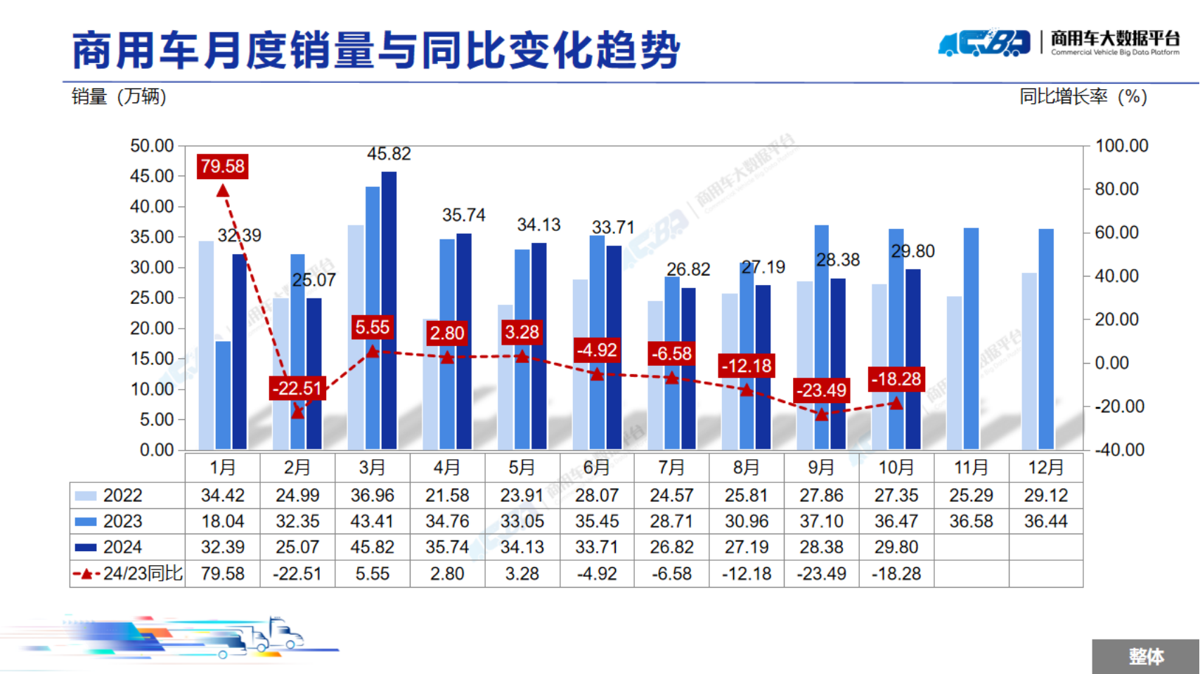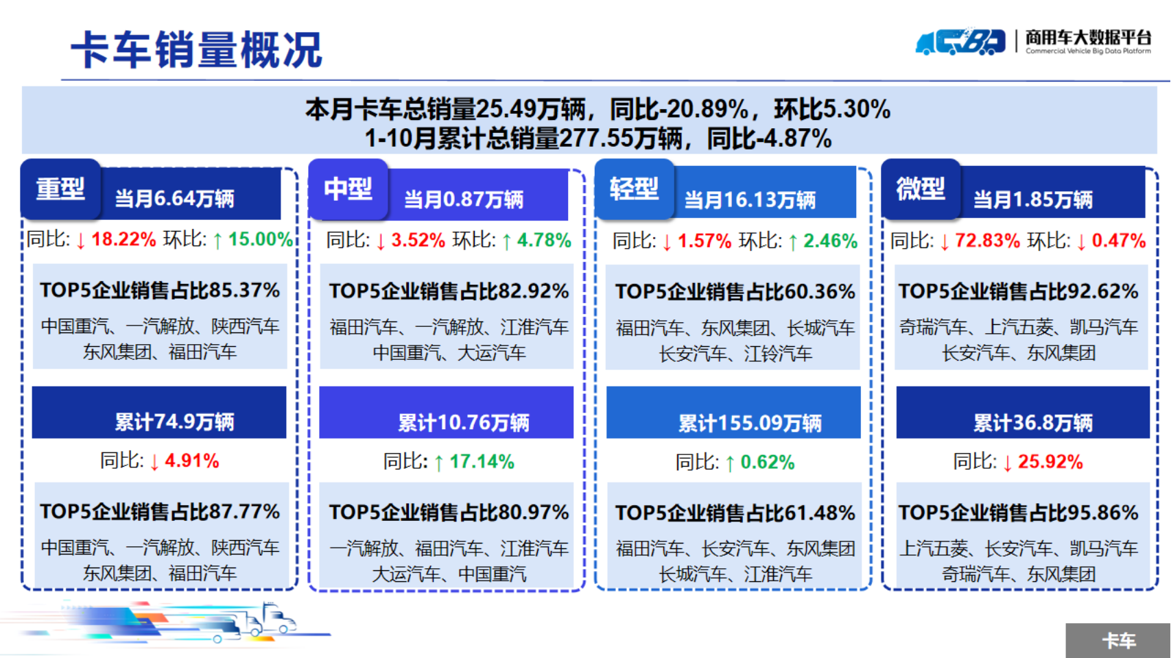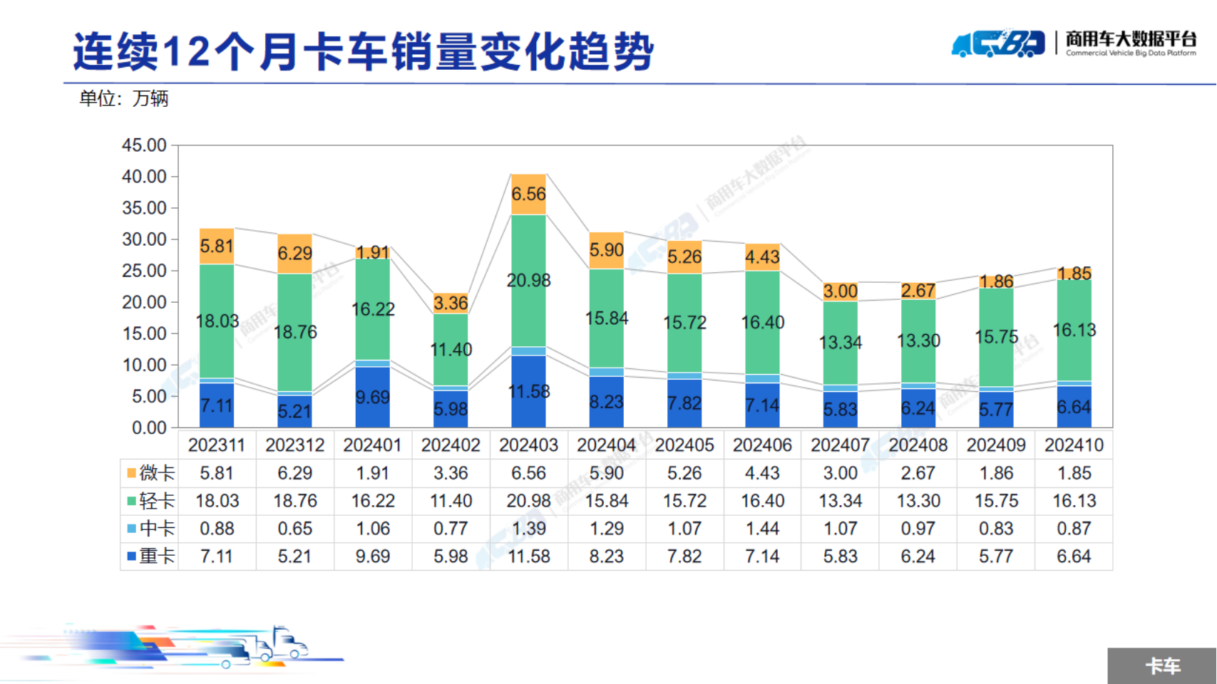 下一篇:数据:2024年10月全国重型卡车销量为6.64万辆,同比下降18.22%;中型卡车销量为0.87万辆,同比下降3.52%
