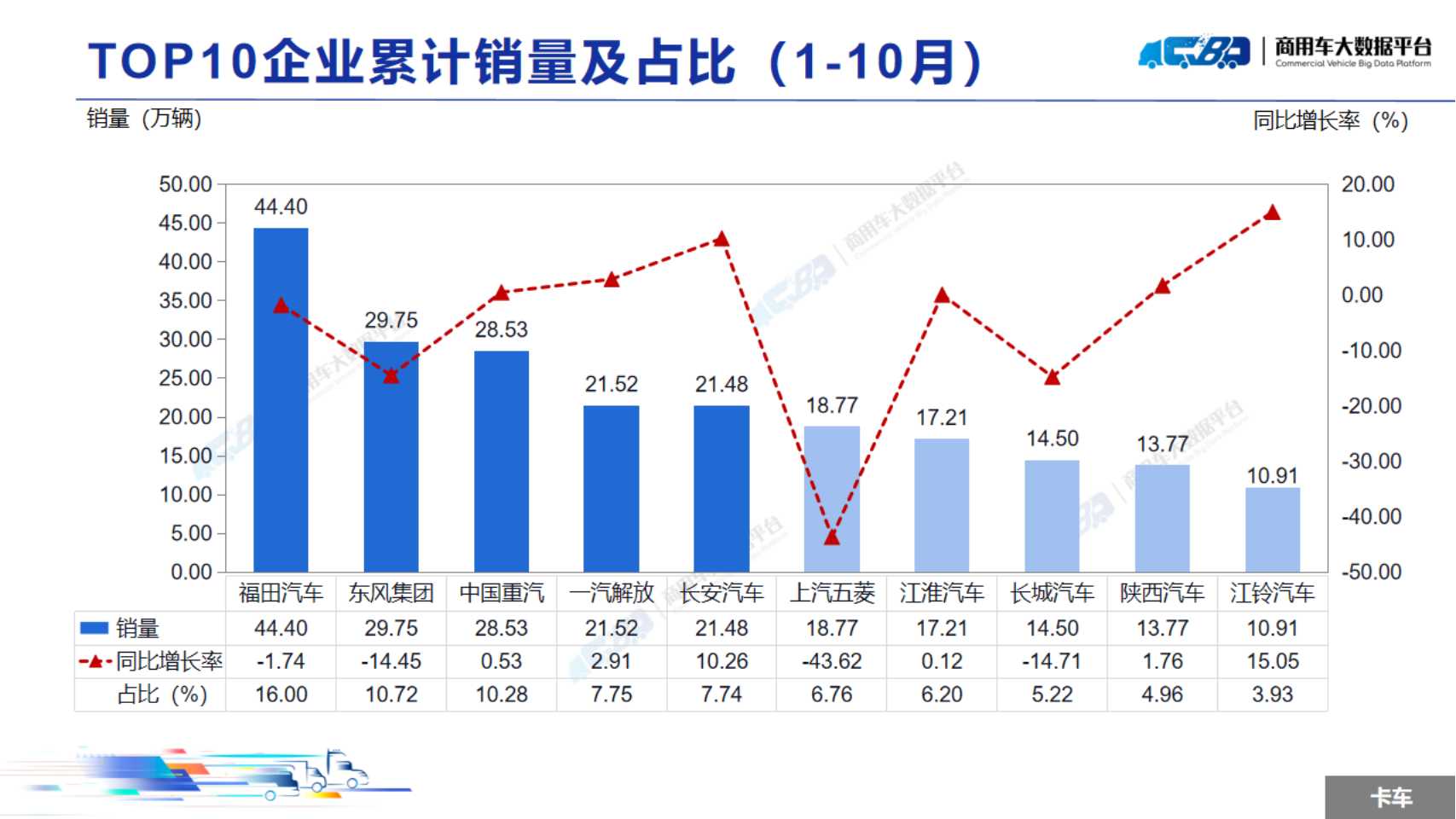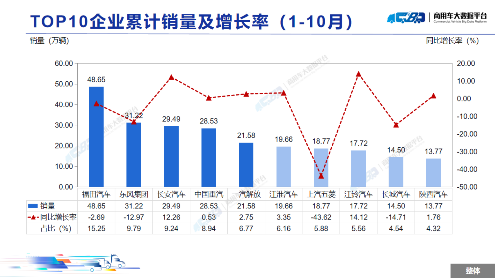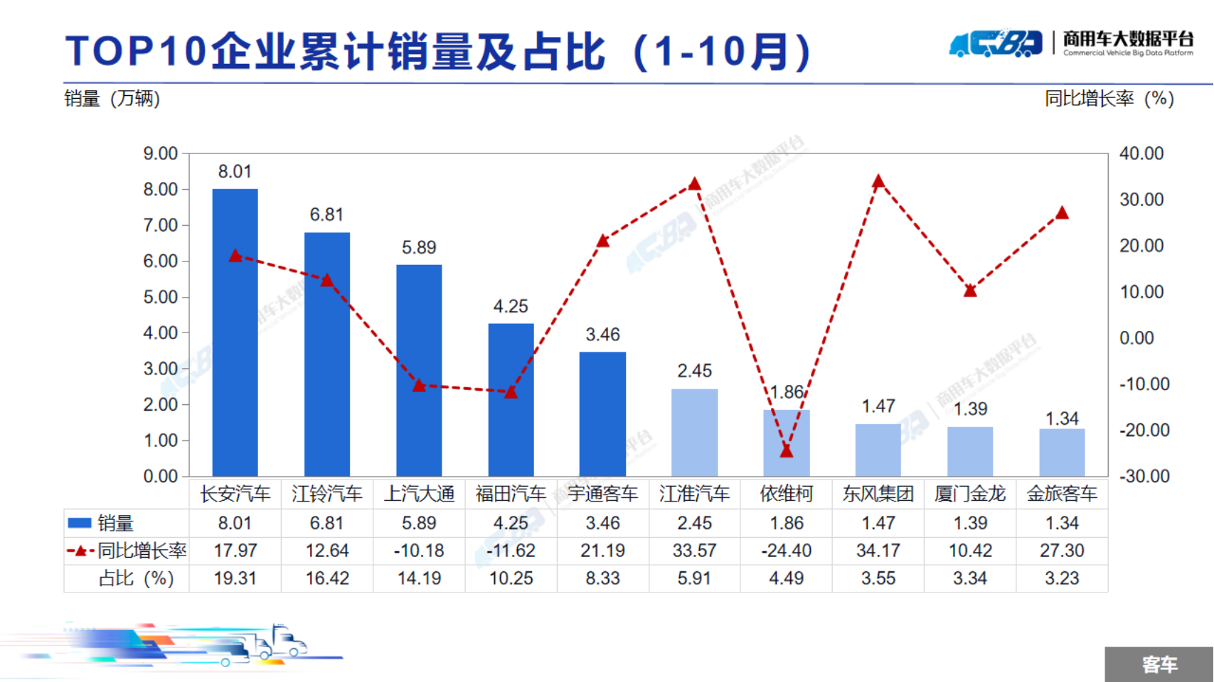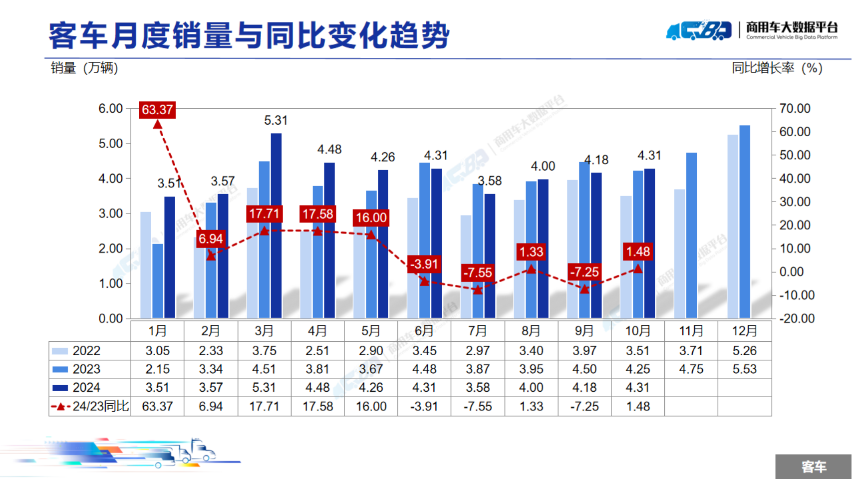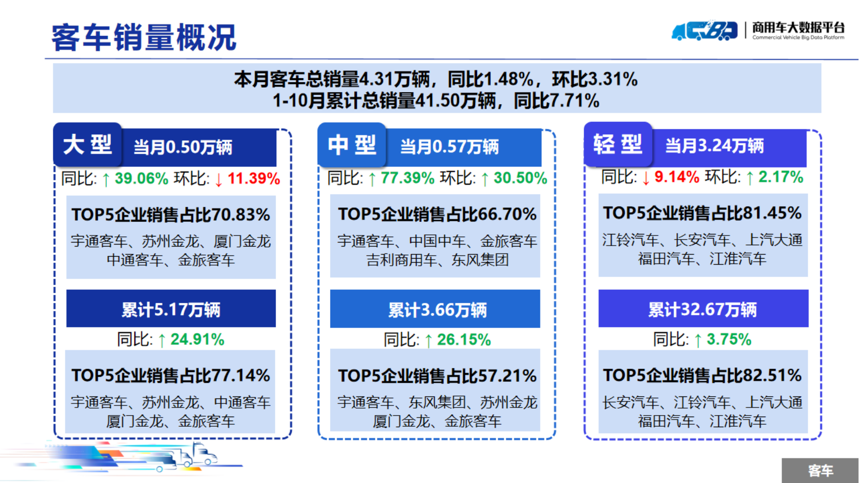 2024年1-10月全国商用车累计销量(批发)为319.05万辆,同比下降3.40%。其中卡车累计销量为277.55万辆,同比下降4.87%;客车累计销量为41.5万辆,同比上涨7.71%。