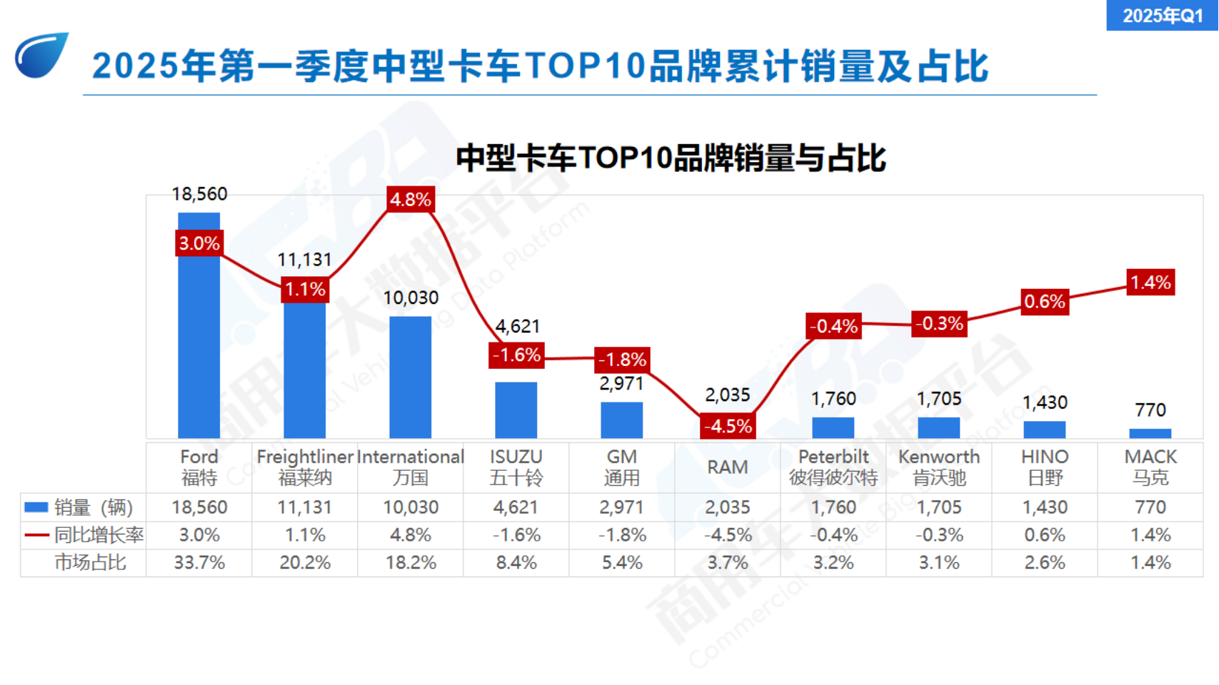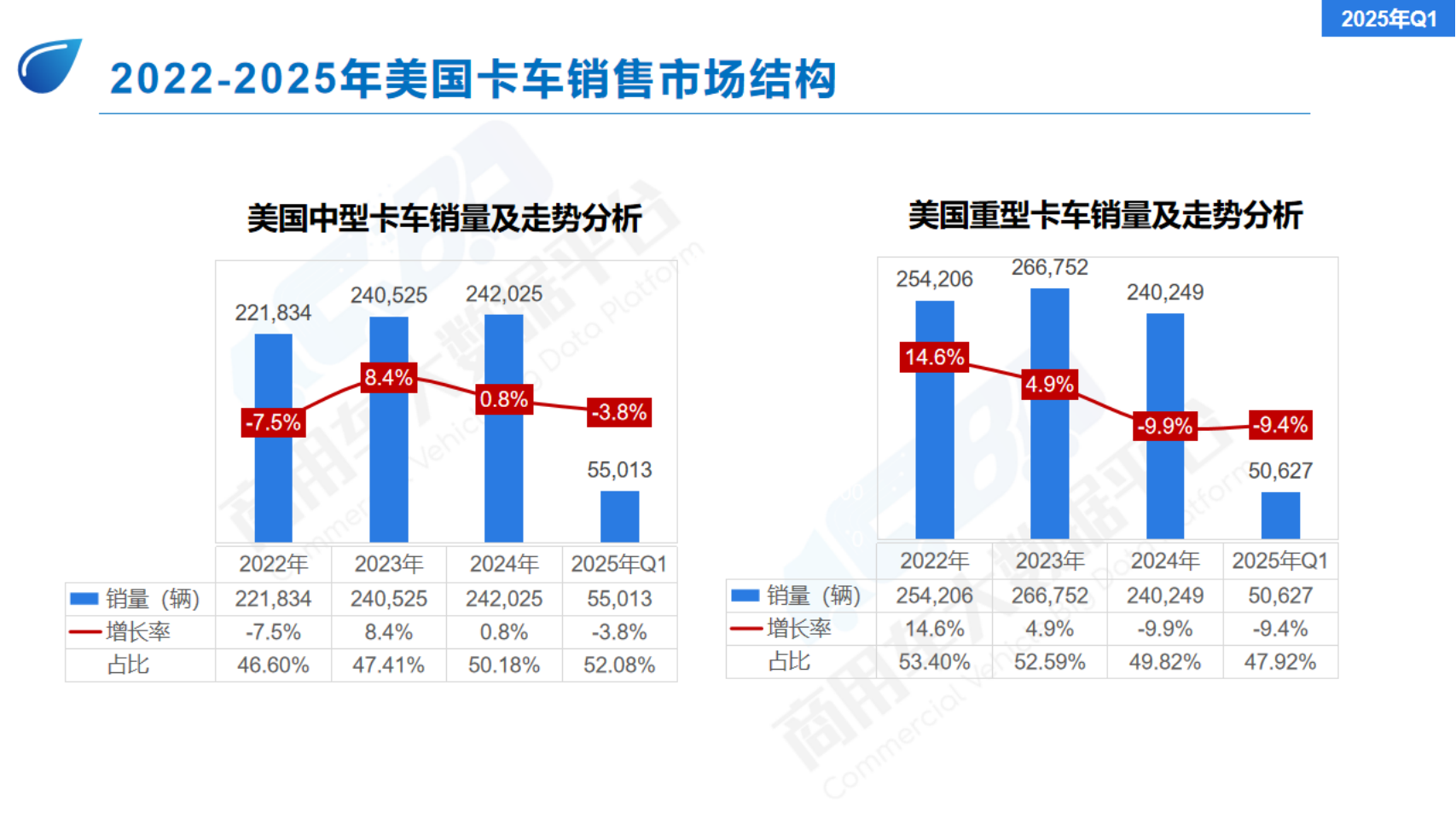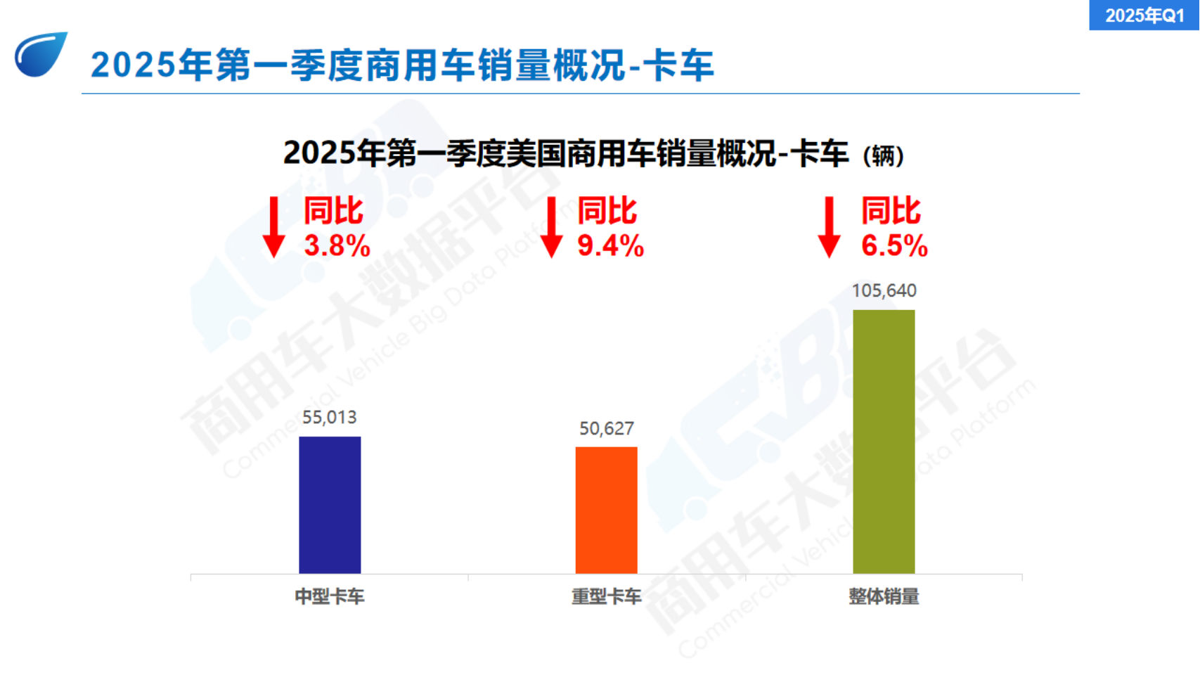 据商用车大数据平台统计显示,2025年第一季度美国卡车销量为10.6万辆,同比下降6.5%。从类型来看,重型卡车销量为5.1万辆,同比下降9.4%;中型卡车销量为5.5万辆,同比下降3.8%。