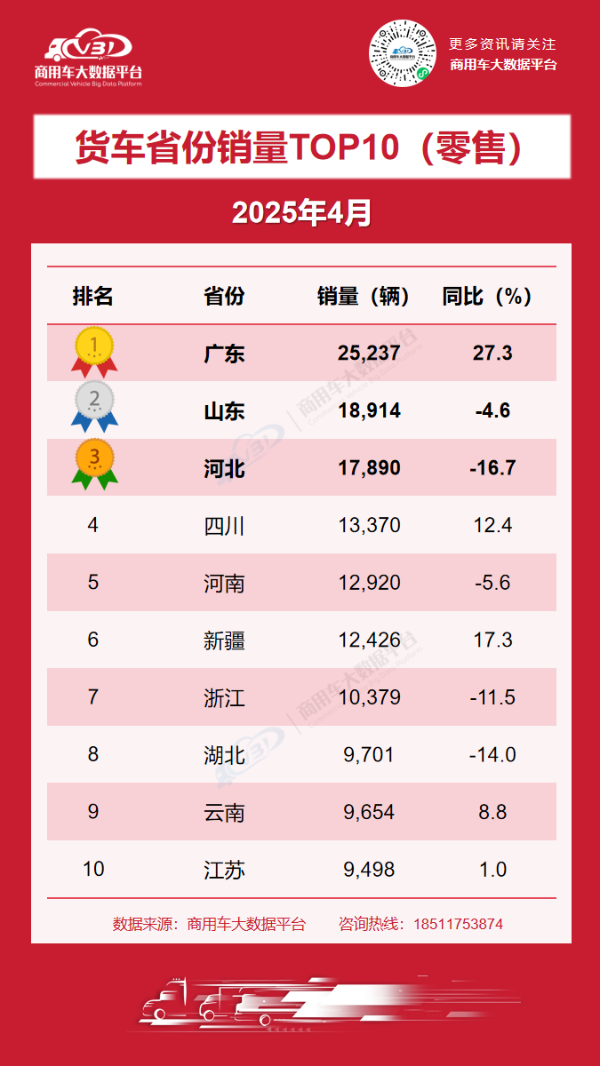 据商用车大数据平台公布的数据,2025年4月货车零售销量TOP10省份与城市为: