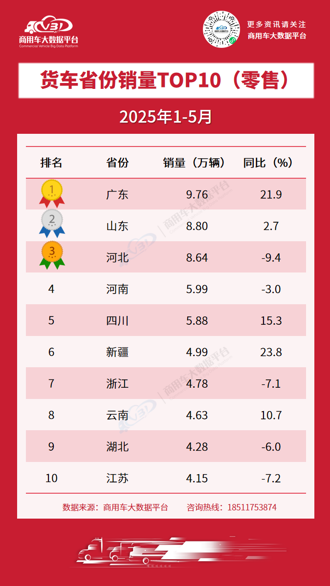 据商用车大数据平台公布的数据,2025年1-5月货车累计零售销量TOP10省份与城市为: