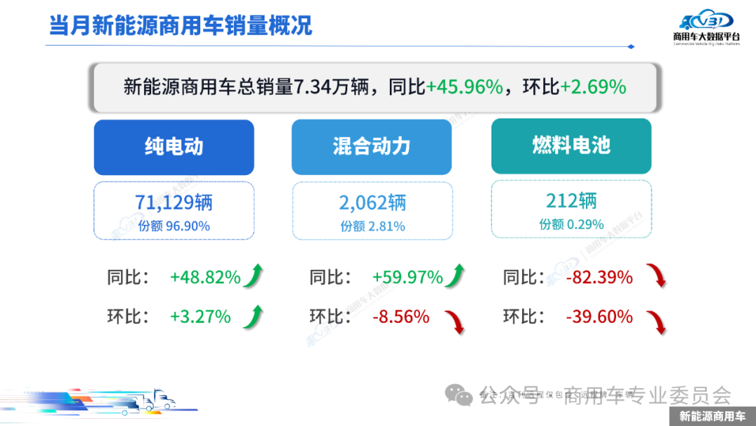 中国汽车流通协会商用车专业委员会提供的销量数据显示,2025年8月新能源商用车零售销量为7.34万辆,同比增长45.96%,环比增长2.69%。其中96.9%的销量来源于纯电动商用车,销量达到7.11万辆,同比增长48.82%。