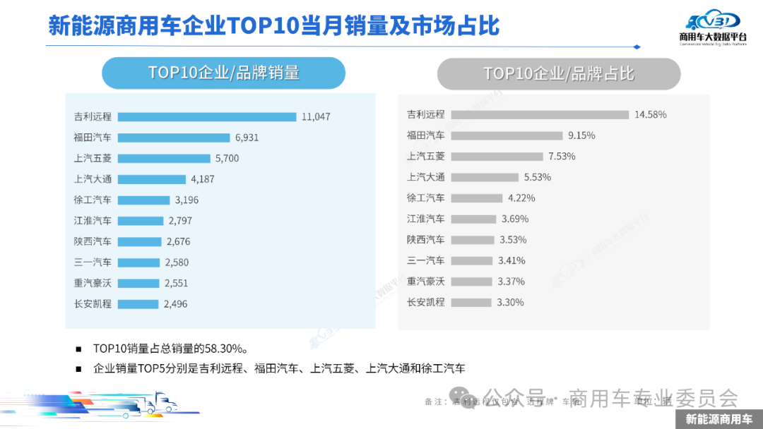 从企业/品牌表现来看,TOP5企业/品牌销量占比为41.01%,分别是吉利远程、福田汽车、上汽五菱、上汽大通和徐工汽车。