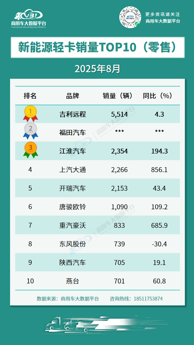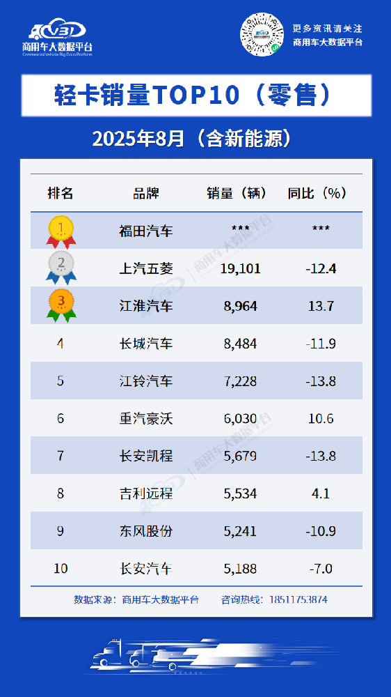 根据商用车大数据平台公布的数据,2025年8月轻卡、新能源轻卡零售销量TOP10品牌为: