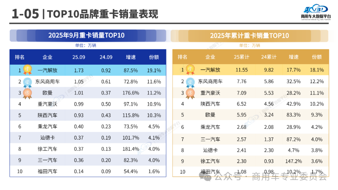 9月重型卡车销量TOP5品牌占比63.1%,依次为一汽解放、东风商用车、欧曼、重汽豪沃、陕西汽车;1-9月累计销量TOP5品牌占比60.9%,依次为一汽解放、东风商用车、重汽豪沃、陕西汽车、欧曼。