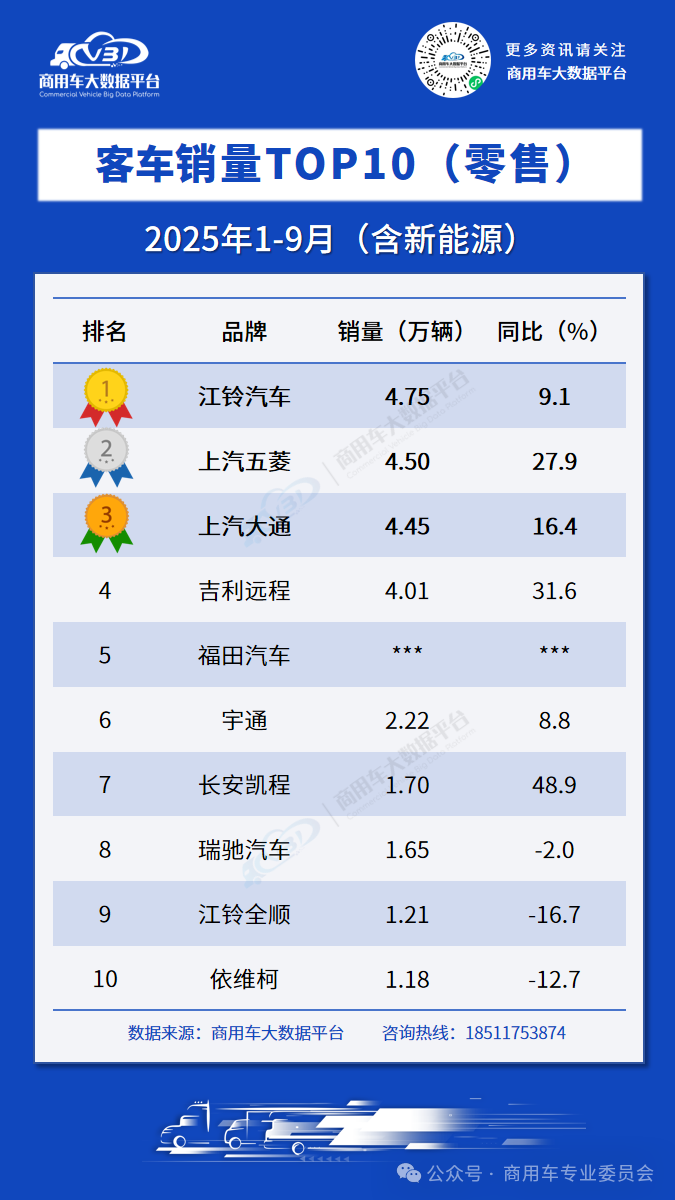 2025年9月客车零售销量TOP10品牌为: