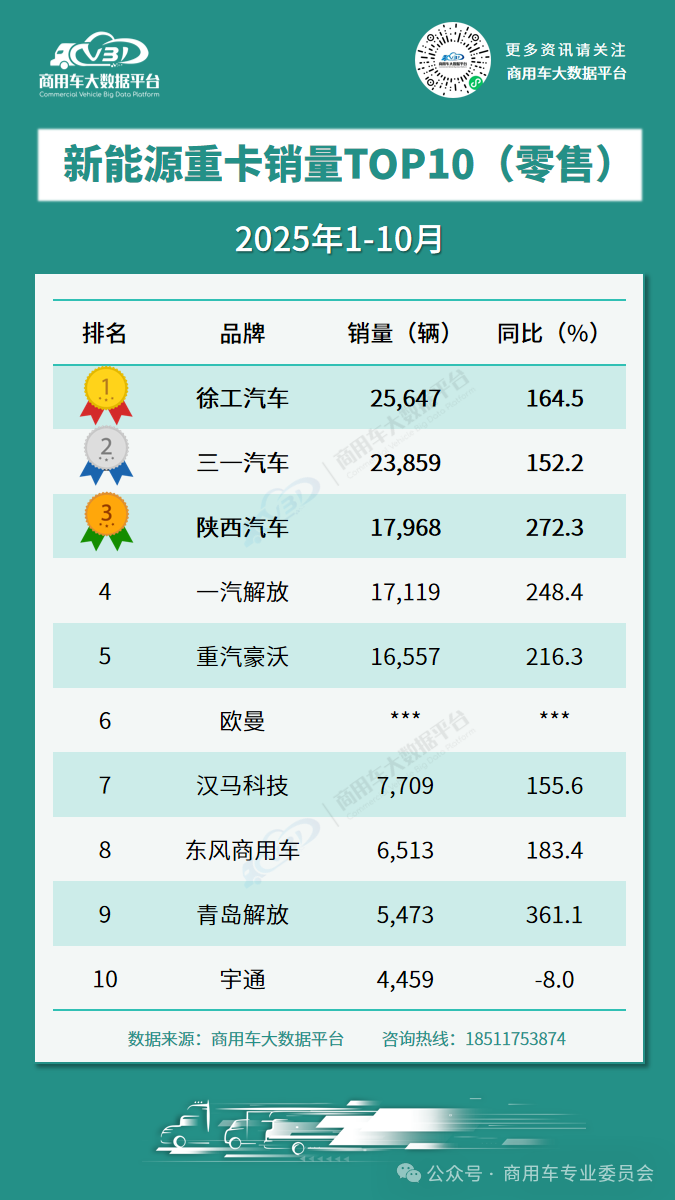 2025年10月新能源重卡零售销量TOP10品牌为: