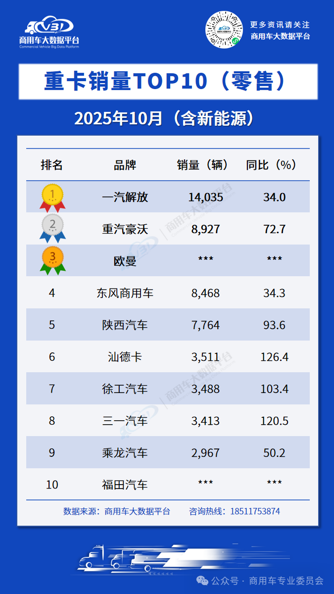 2025年1-10月重卡累计零售销量TOP10品牌为: