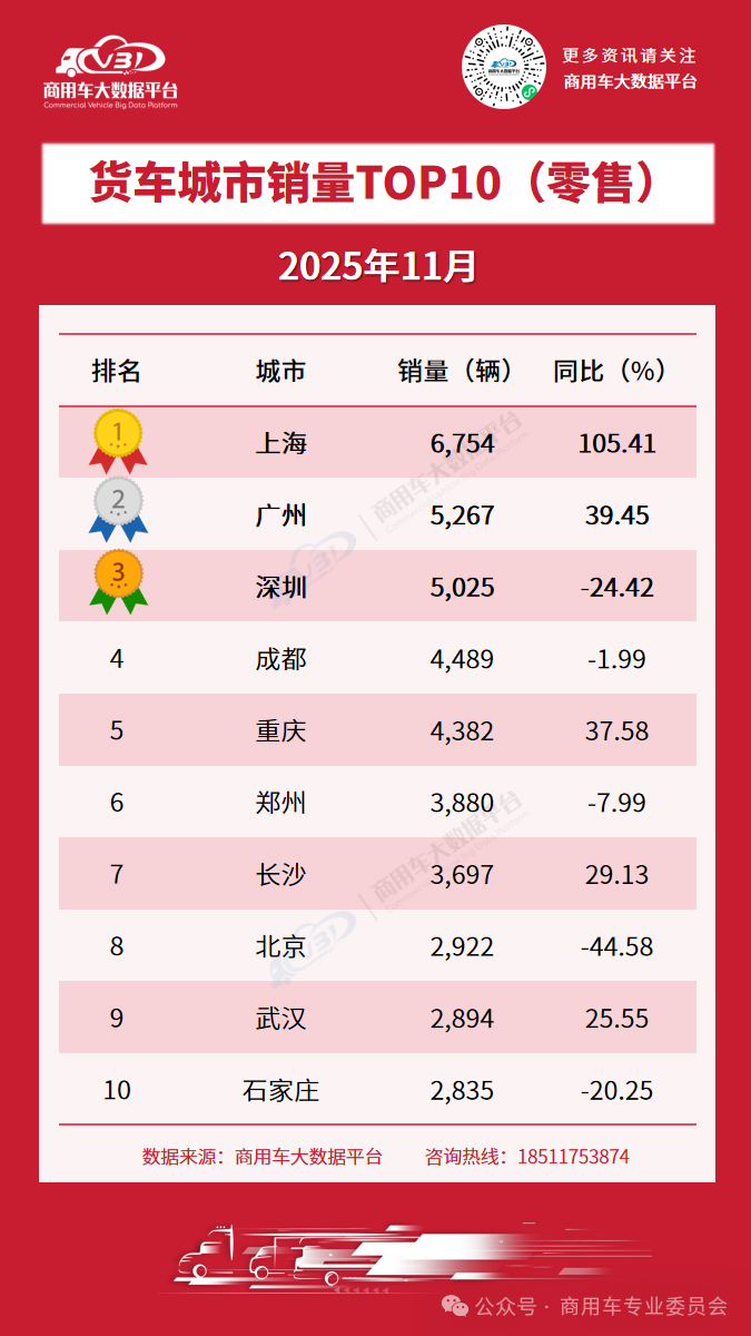 2025年11月货车零售销量TOP10城市为: