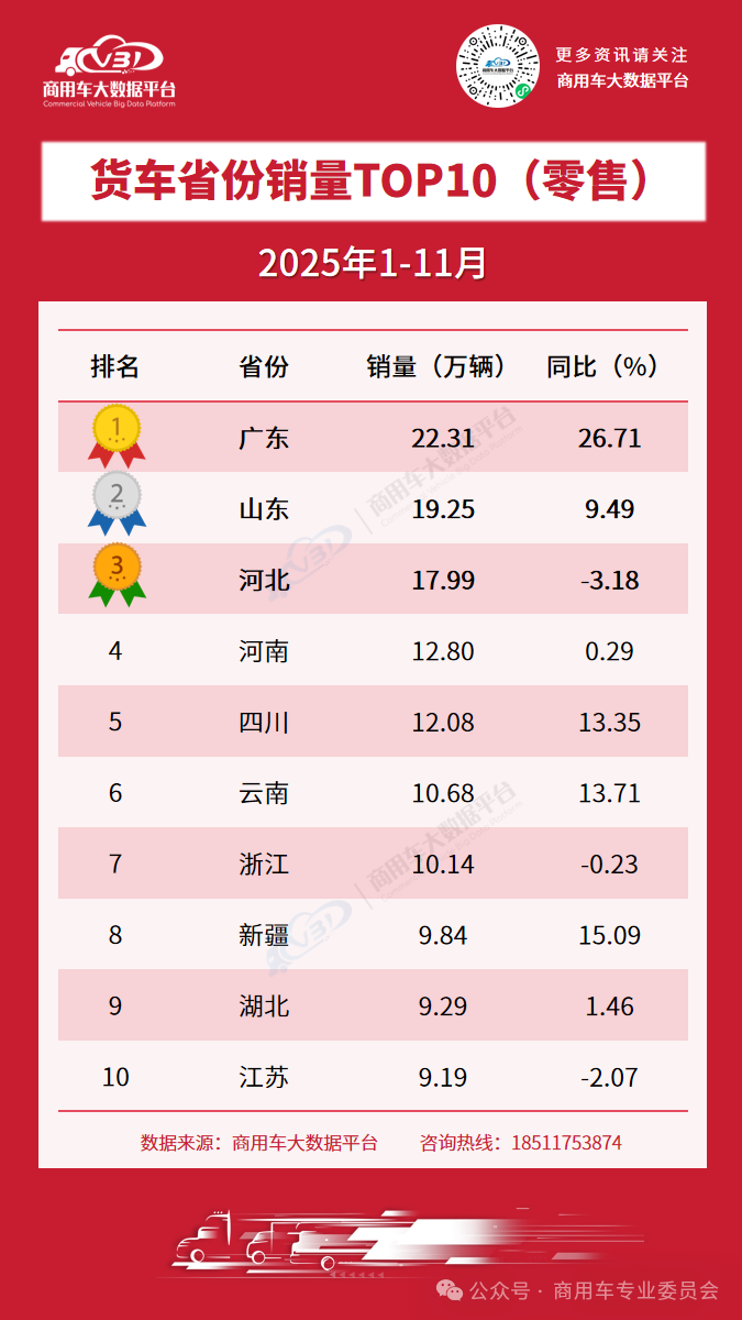 2025年11月货车零售销量TOP10省份为: