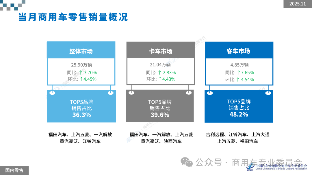 中国汽车流通协会商用车专业委员会提供的销量数据显示,2025年11月全国商用车零售销量为25.90万辆,同比增长3.70%,环比增长4.45%。