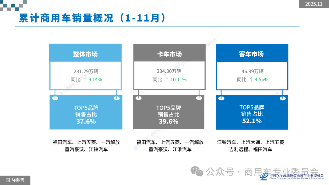 2025年1-11月,商用车新车零售销量为281.29万辆,累计同比增长9.14%。其中11月销量为25.90万辆,同比增长3.70%,环比增长4.45%。
