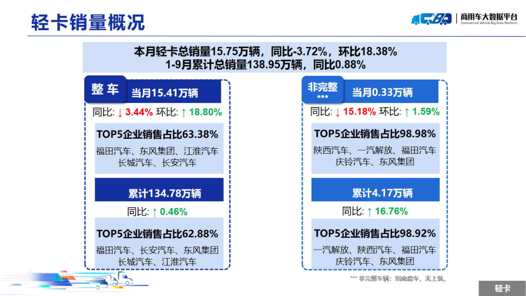 2024年1-9月全国累计轻型卡车销量(批发)为138.95万辆,同比上涨0.88%;累计微型卡车销量(批发)为34.95万辆,同比下降18.47%。