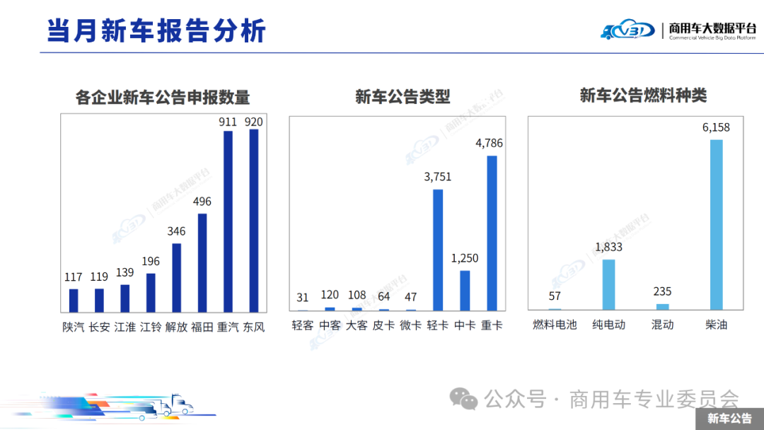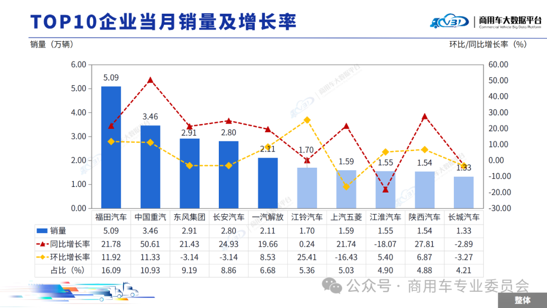 当月TOP5企业销量占比为51.76%,依次为福田汽车、中国重汽、东风集团、长安汽车、一汽解放。