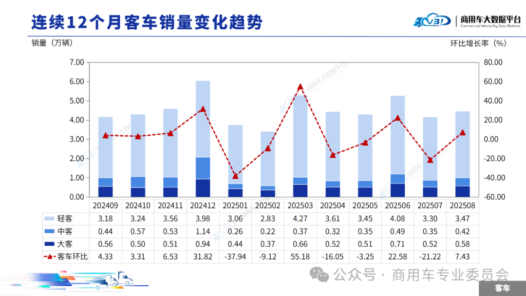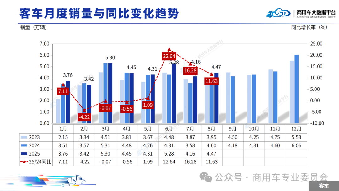 2025年8月客车销量(批发)为4.47万辆,同比增长11.63%,环比增长7.43%。1-8月客车累计销量(批发)35.15万辆,同比增长6.48%。