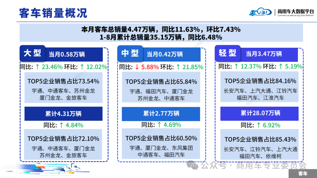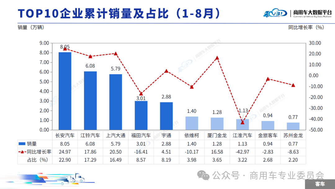 1-8月客车TOP5企业销量占比为73.45%,依次为长安汽车、江铃汽车、上汽大通、福田汽车、宇通。