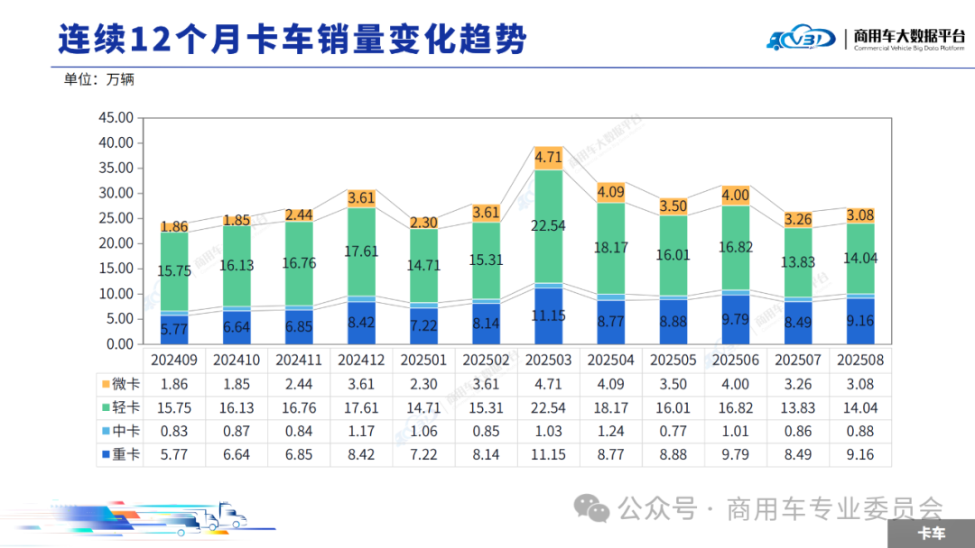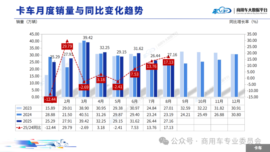 2025年8月卡车销量(批发)为27.16万辆,同比增长17.13%,环比增长2.71%。1-8月卡车累计销量(批发)239.24万辆,同比增长5.00%。