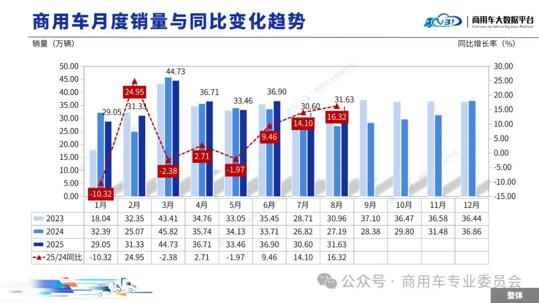 2025年8月全国商用车整体销量(批发)为31.63万辆,同比增长16.32%,环比增长3.35%。1-8月全国商用车累计整体销量(批发)为274.39万辆,累计同比增长5.18%。