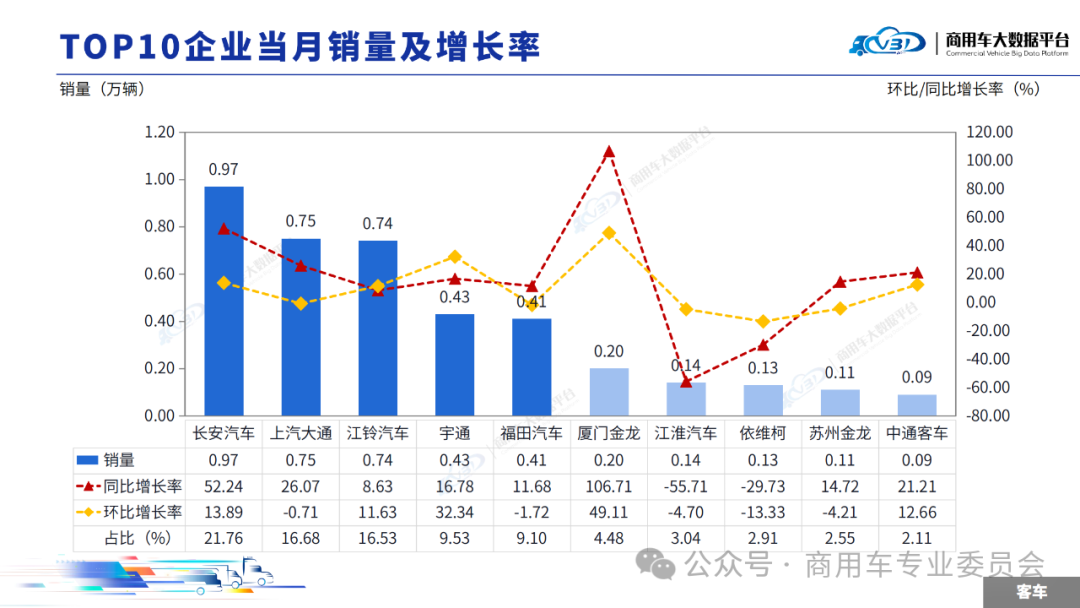当月客车TOP5企业销量占比为73.60%,依次为长安汽车、上汽大通、江铃汽车、宇通、福田汽车。