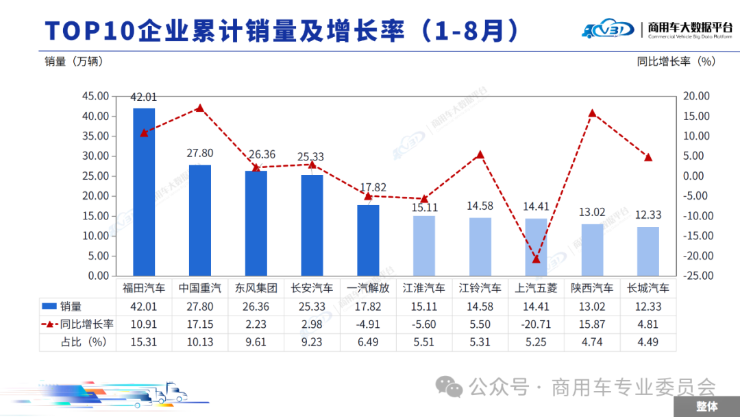 1-8月累计TOP5企业销量占比为50.77%,依次为福田汽车、中国重汽、东风集团、长安汽车、一汽解放。