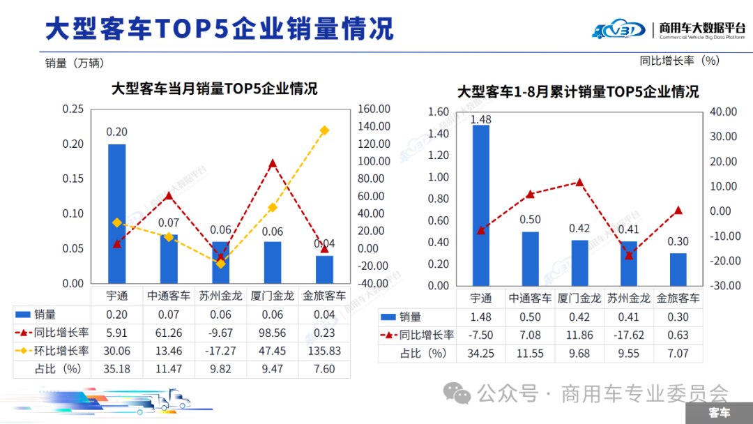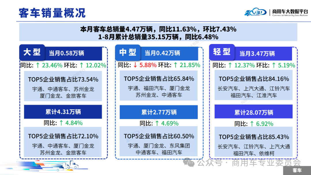 2025年8月客车销量(批发)为4.47万辆,同比增长11.63%,环比增长7.43%;1-8月累计销量(批发)为35.15万辆,同比增长6.48%。其中大型客车当月销量0.58万辆,累计销量4.31万辆;中型客车当月销量0.42万辆,累计销量2.77万辆;轻型客车当月销量3.47万辆,累计销量28.07万辆。当月大型客车销量(批发)TOP5企业占比73.54%,依次为宇通、中通客车、苏州金龙、厦门金龙、金旅客车。1-8月大型客车累计销量(批发)TOP5企业占比72.10%,依次为宇通、中通客车、厦门金龙、苏州金龙、金旅客车。