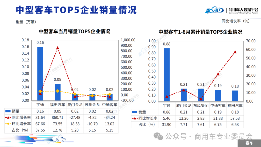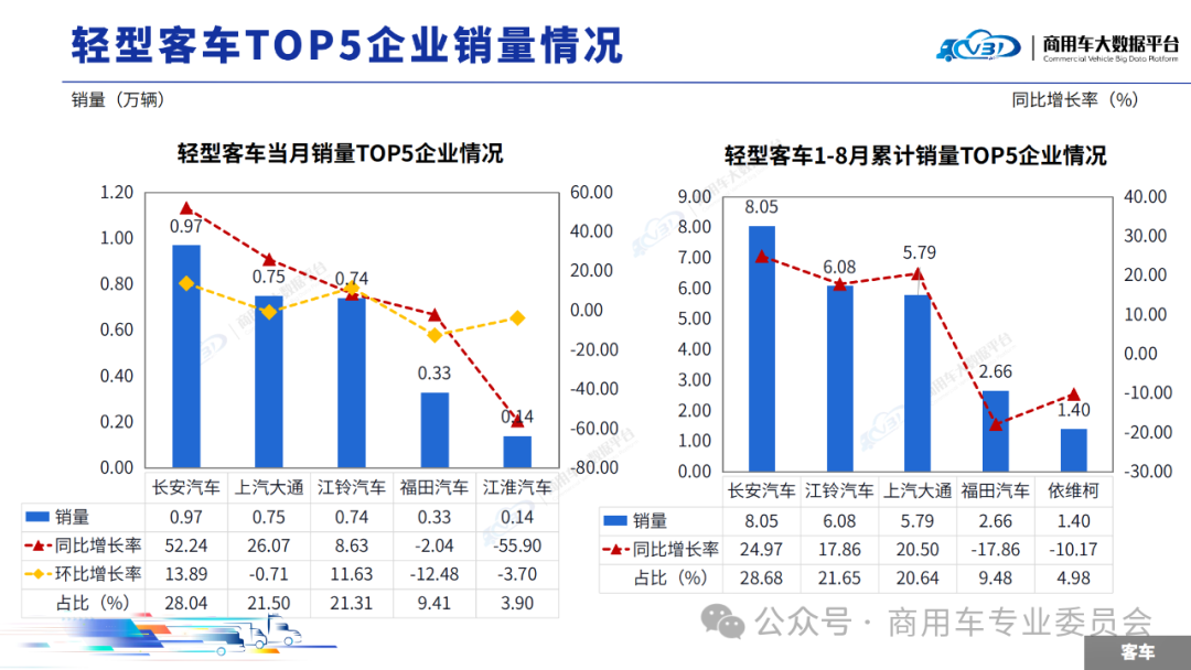 当月中型客车销量(批发)TOP5企业占比65.83%,依次为宇通、福田汽车、厦门金龙、苏州金龙、中通客车。1-8月中型客车累计销量(批发)TOP5企业占比60.50%,依次为宇通、厦门金龙、东风集团、中通客车、福田汽车。当月轻型客车销量(批发)TOP5企业占比84.16%,依次为长安汽车、上汽大通、江铃汽车、福田汽车、江淮汽车。1-8月轻型客车累计销量(批发)TOP5企业占比85.43%,依次为长安汽车、江铃汽车、上汽大通、福田汽车、依维柯。