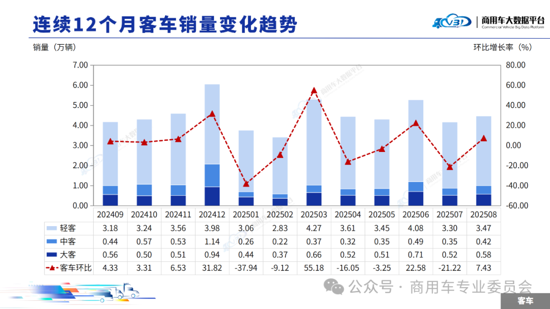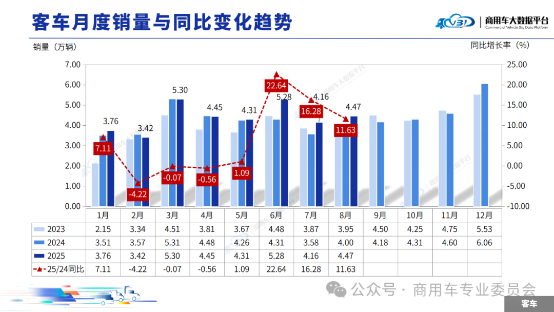 根据商用车大数据平台显示,2025年8月客车销量(批发)为4.47万辆,同比增长11.63%,环比增长7.43%。