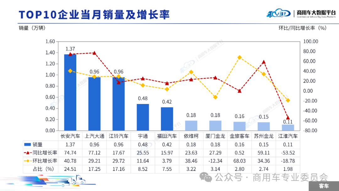 当月客车TOP5企业销量占比为75.00%,依次为长安汽车、上汽大通、江铃汽车、宇通、福田汽车。