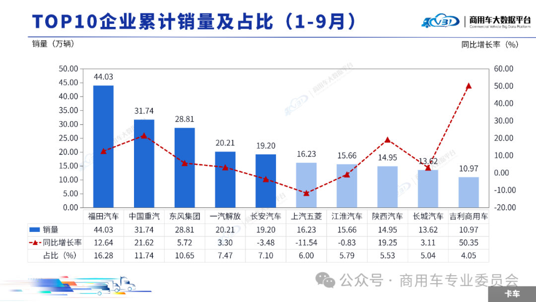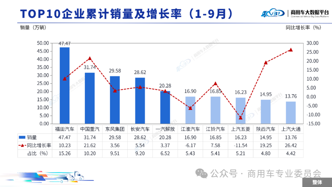 1-9月累计TOP5企业销量占比为50.68%,依次为福田汽车、中国重汽、东风集团、长安汽车、一汽解放。