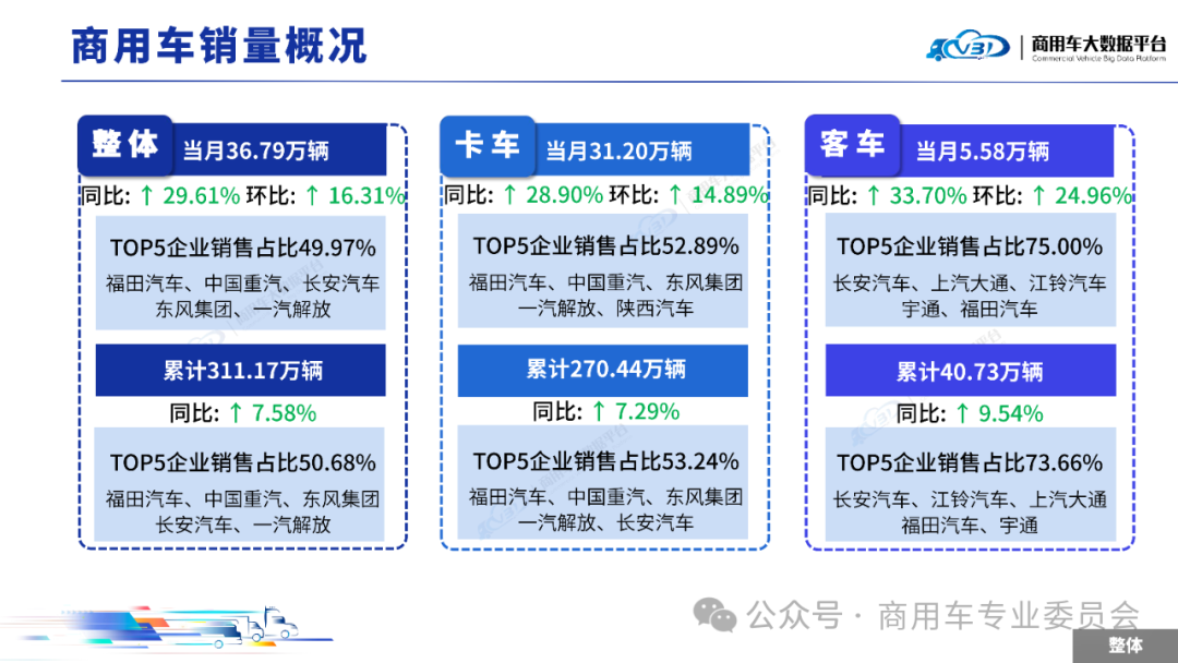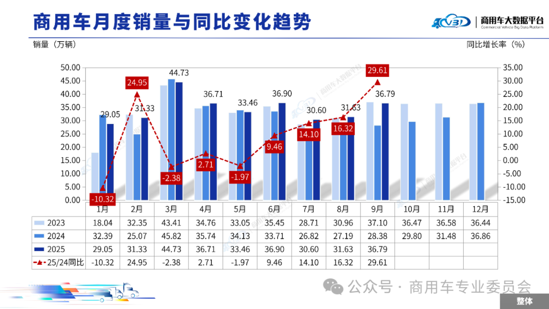 2025年9月全国商用车整体销量(批发)为36.79万辆,同比增长29.61%,环比增长16.31%;1-9月全国商用车累计整体销量(批发)为311.17万辆,累计同比增长7.58%。