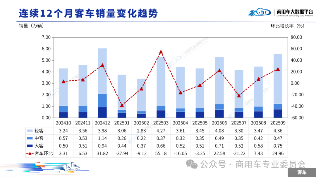 2025年9月客车销量(批发)为5.58万辆,同比增长33.70%,环比增长24.96%;1-9月客车累计销量(批发)40.73万辆,同比增长9.54%。