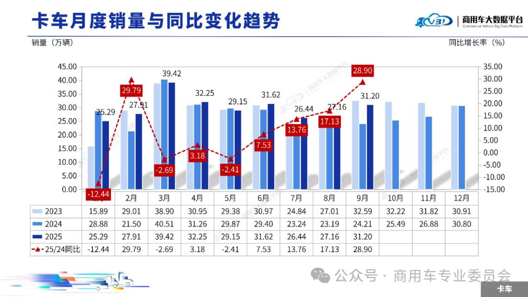 2025年9月卡车销量(批发)为31.20万辆,同比增长28.90%,环比增长14.89%;1-9月卡车累计销量(批发)270.44万辆,同比增长7.29%。