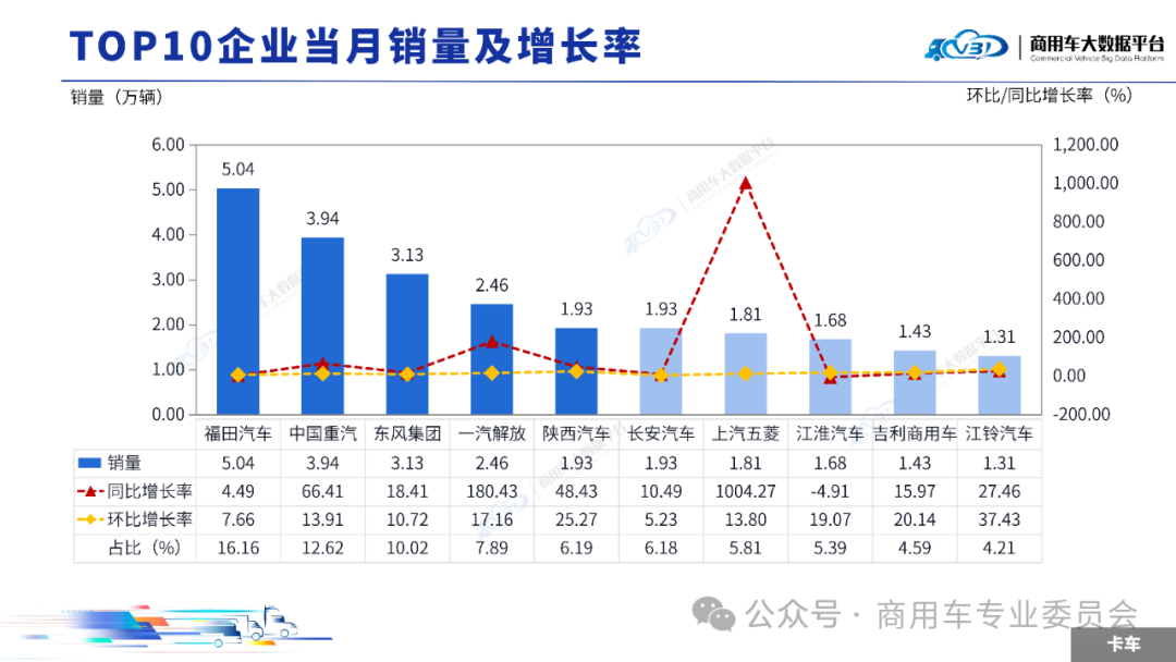 当月TOP5企业销量占比为49.97%,依次为福田汽车、中国重汽、长安汽车、东风集团、一汽解放。