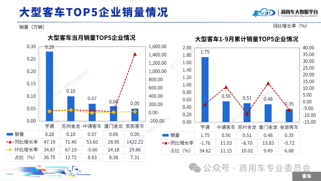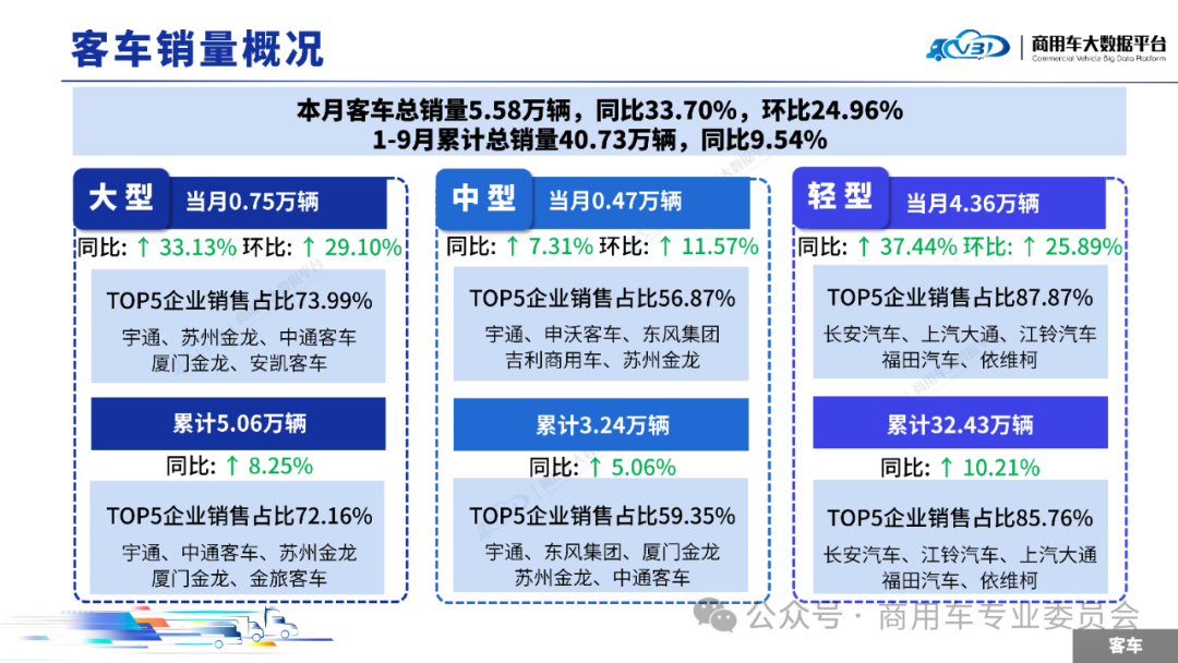 2025年9月客车销量(批发)为5.58万辆,同比增长33.70%,环比增长24.96%;1-9月累计销量(批发)为40.73万辆,同比增长9.54%。其中大型客车当月销量0.75万辆,累计销量5.06万辆;中型客车当月销量0.47万辆,累计销量3.24万辆;轻型客车当月销量4.36万辆,累计销量32.43万辆。当月大型客车销量(批发)TOP5企业占比73.99%,依次为宇通、苏州金龙、中通客车、厦门金龙、安凯客车。