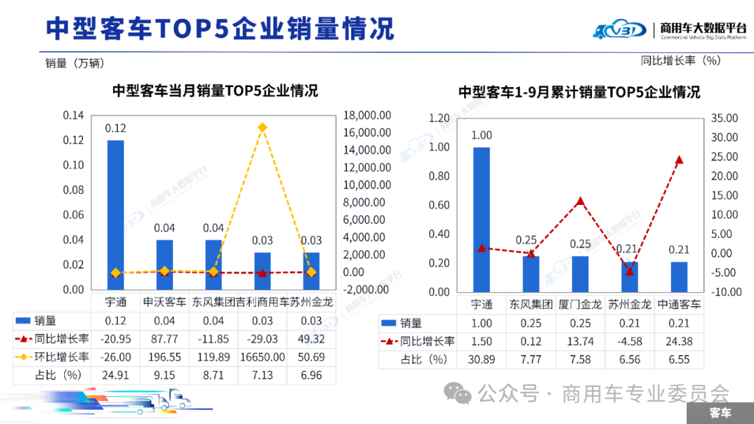 当月中型客车销量(批发)TOP5企业占比56.86%,依次为宇通、申沃客车、东风集团、吉利商用车、苏州金龙。1-9月中型客车累计销量(批发)TOP5企业占比59.35%,依次为宇通、东风集团、厦门金龙、苏州金龙、中通客车。当月轻型客车销量(批发)TOP5企业占比87.86%,依次为长安汽车、上汽大通、江铃汽车、福田汽车、依维柯。