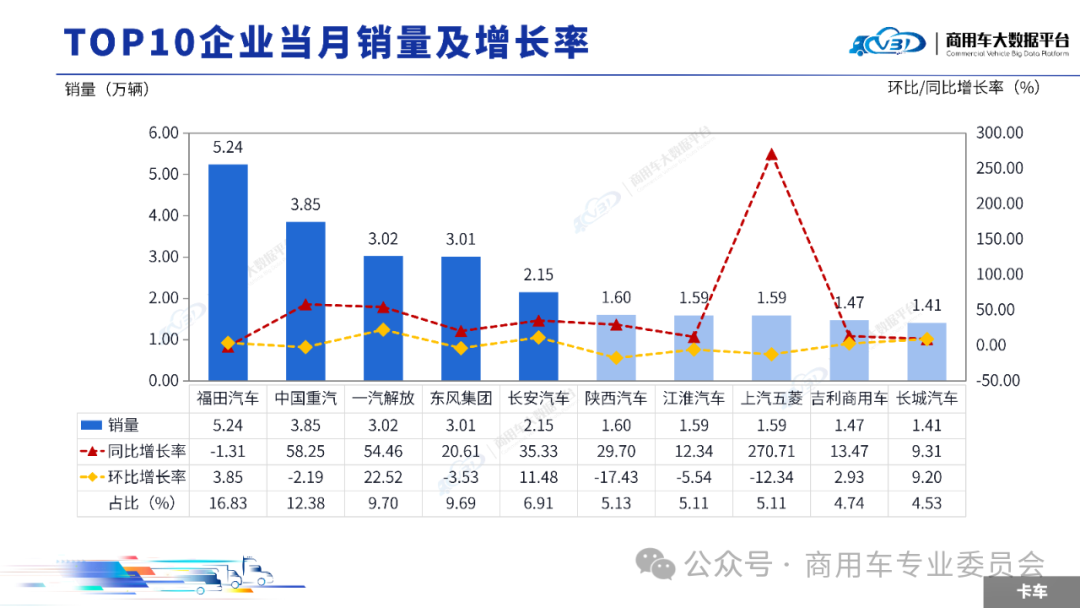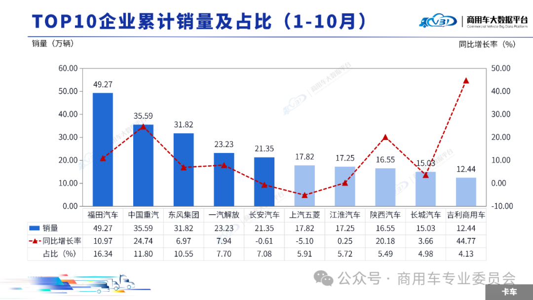 1-10月累计TOP5企业销量占比为50.86%,依次为福田汽车、中国重汽、东风集团、长安汽车、一汽解放。