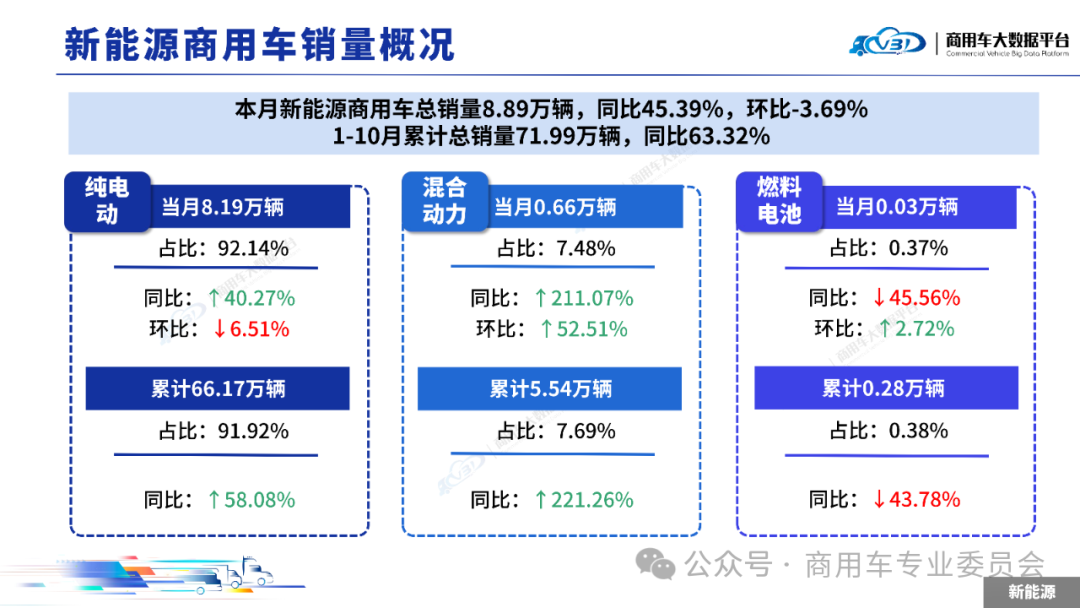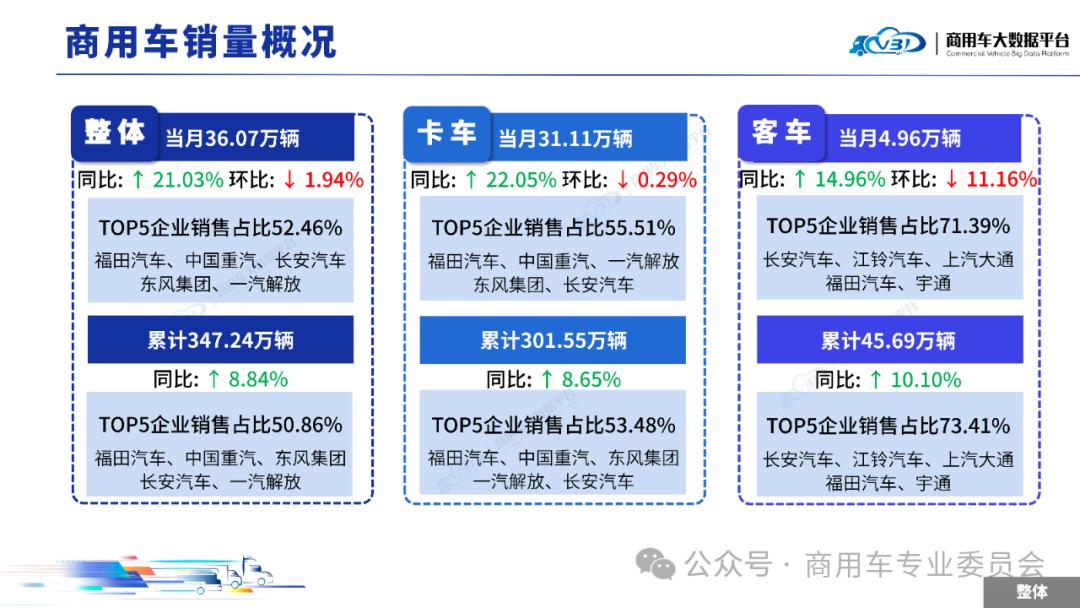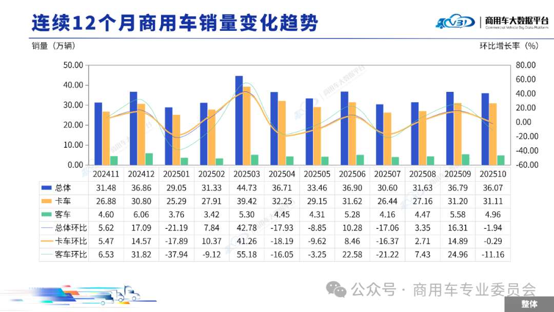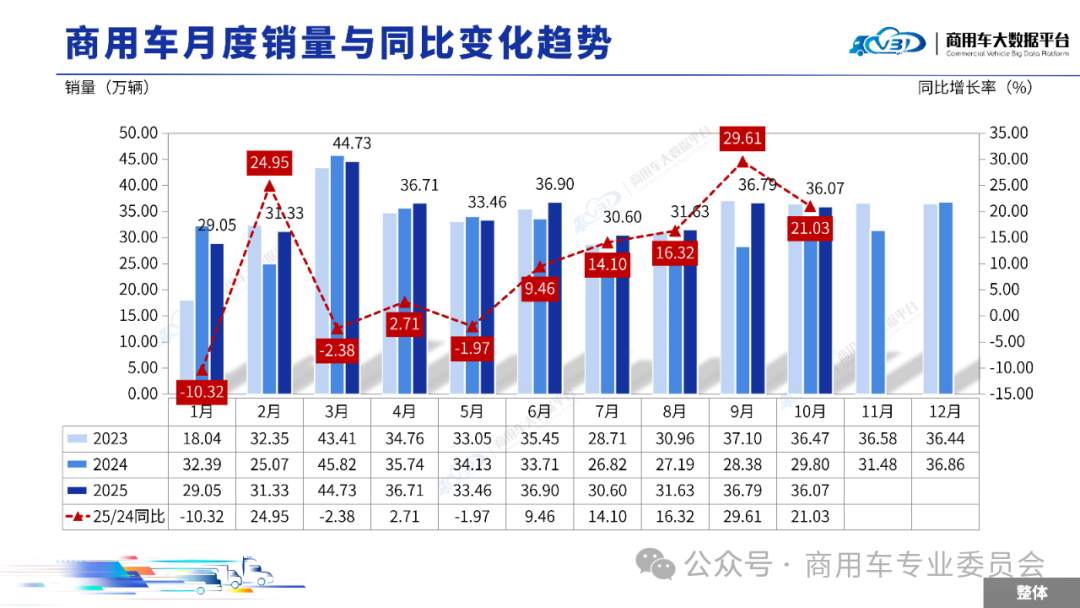 根据商用车大数据平台显示,2025年10月全国商用车整体销量(批发)为36.07万辆,同比增长21.03%,环比下降1.94%;1-10月全国商用车累计整体销量(批发)为347.24万辆,累计同比增长8.84%。