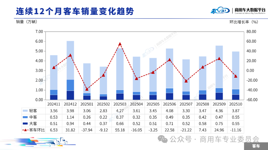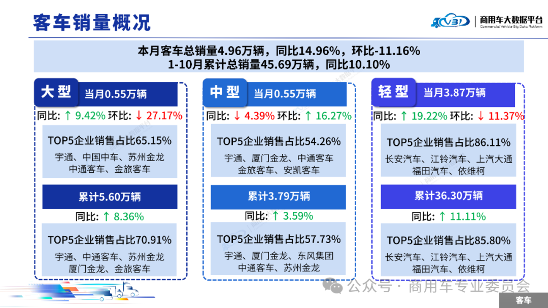 2025年10月客车销量(批发)为4.96万辆,同比增长14.96%,环比下降11.16%;1-10月客车累计销量(批发)45.69万辆,同比增长10.10%。