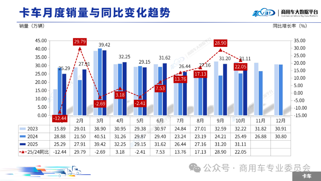 2025年10月卡车销量(批发)为31.11万辆,同比增长22.05%,环比下降0.29%;1-10月卡车累计销量(批发)301.55万辆,同比增长8.65%。