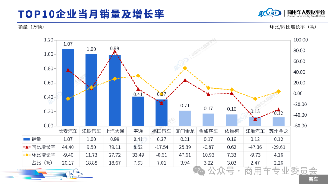 当月客车TOP5企业销量占比为72.35%,依次为长安汽车、江铃汽车、上汽大通、宇通、福田汽车。