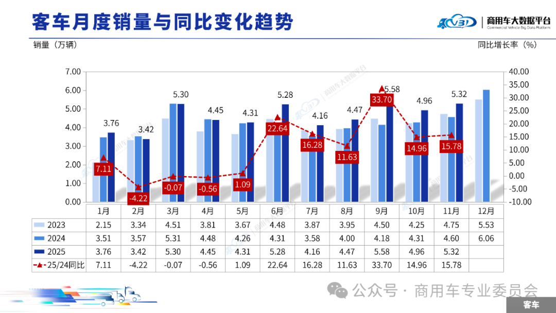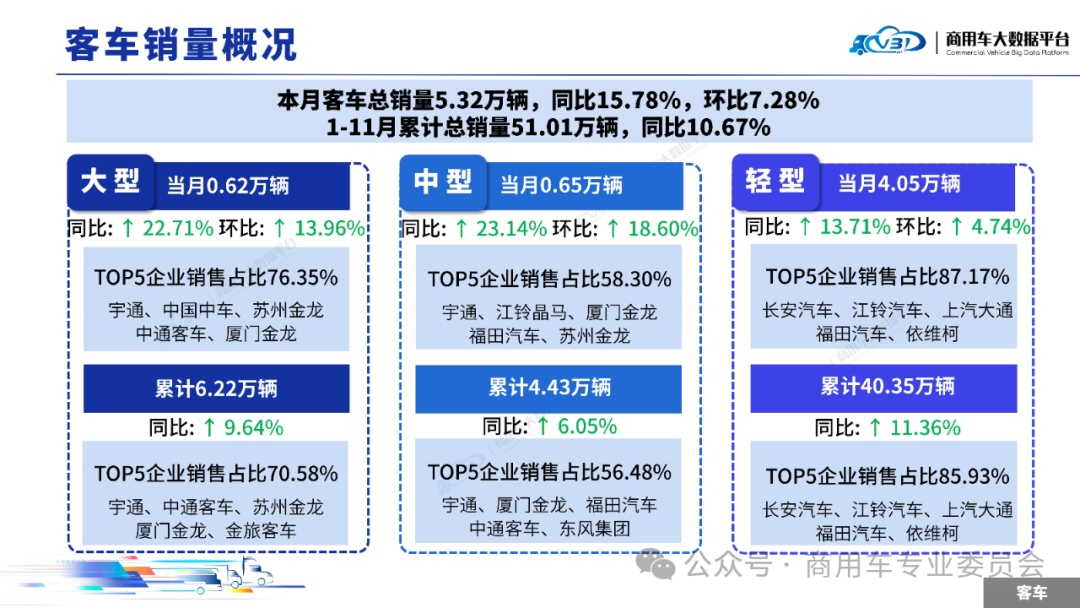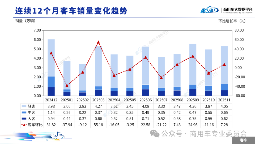 2025年11月客车销量(批发)为5.32万辆,同比增长15.78%,环比增长7.28%;1-11月客车累计销量(批发)51.01万辆,同比增长10.67%。