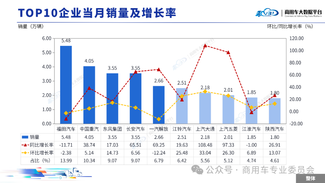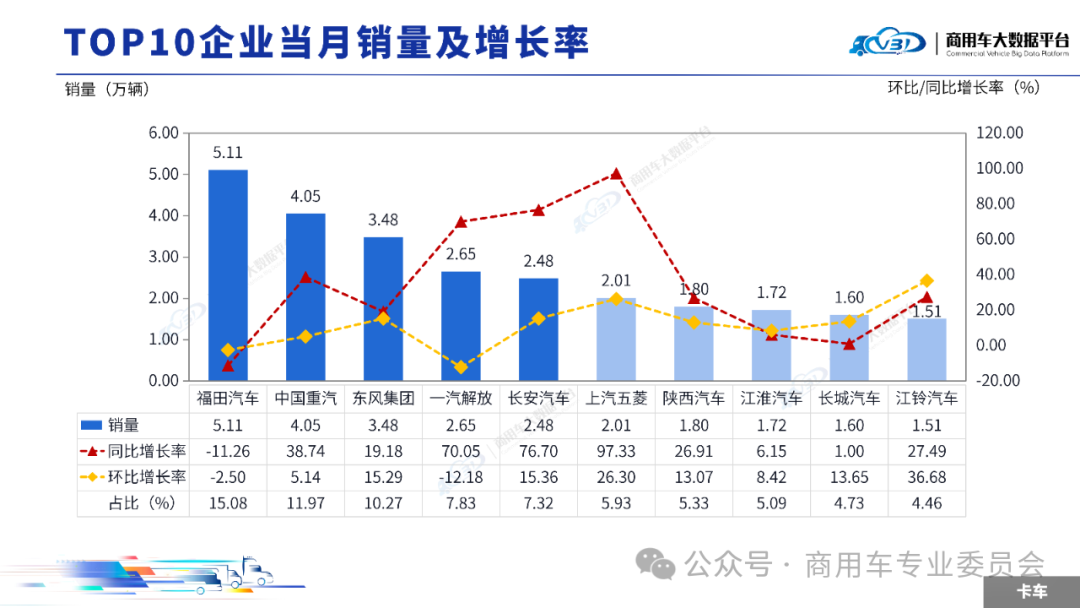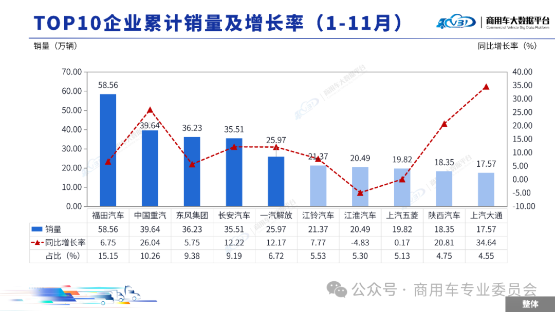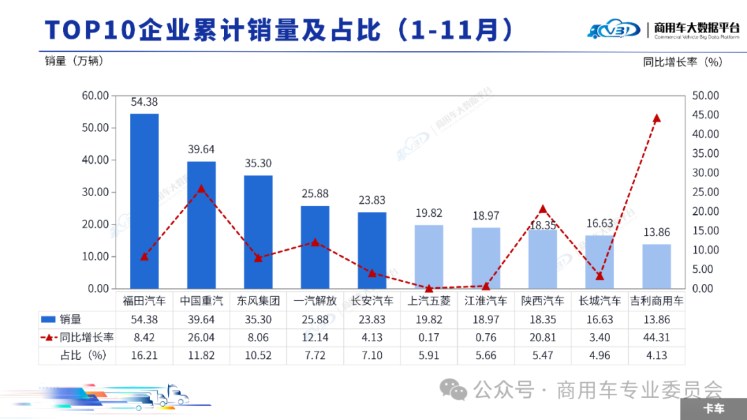 1-11月卡车TOP5企业销量占比为53.38%,依次为福田汽车、中国重汽、东风集团、一汽解放、长安汽车。