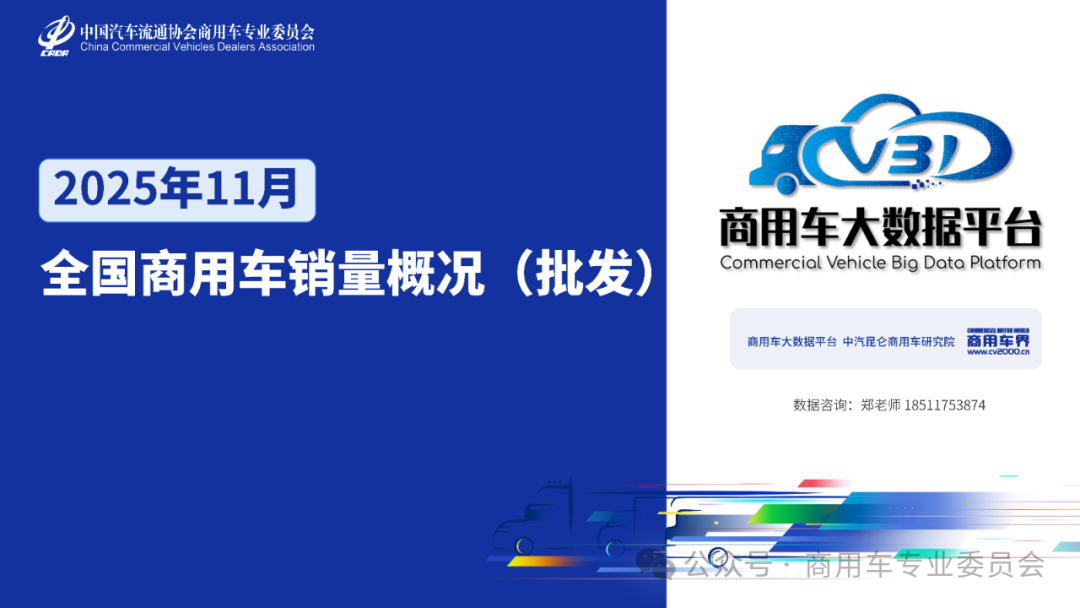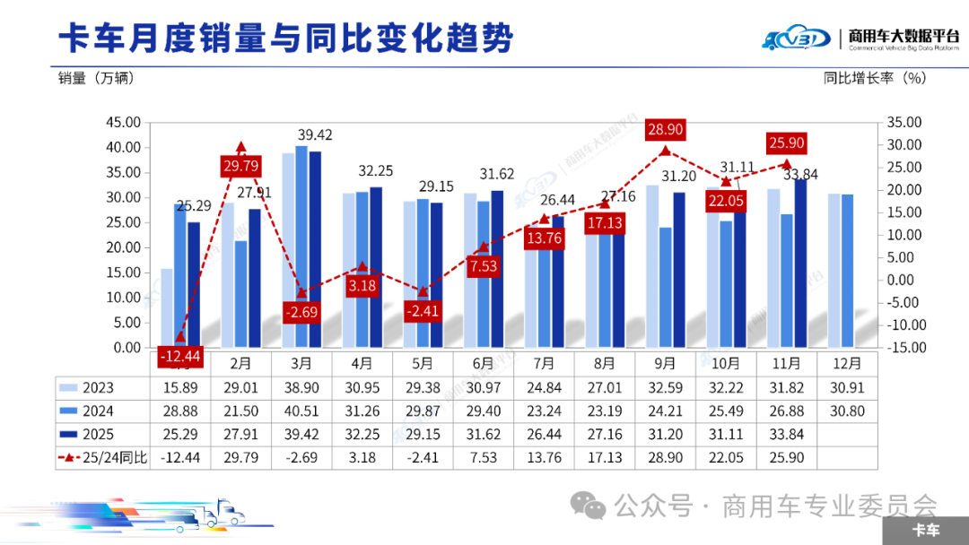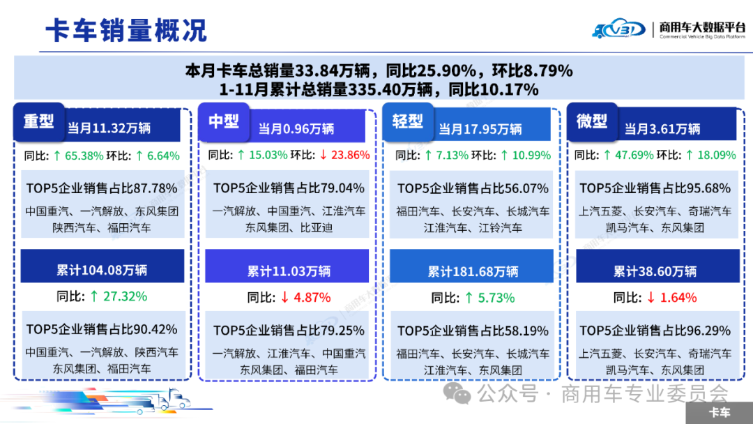 2025年11月卡车销量(批发)为33.84万辆,同比增长25.90%,环比增长8.79%;1-11月卡车累计销量(批发)335.40万辆,同比增长10.17%。