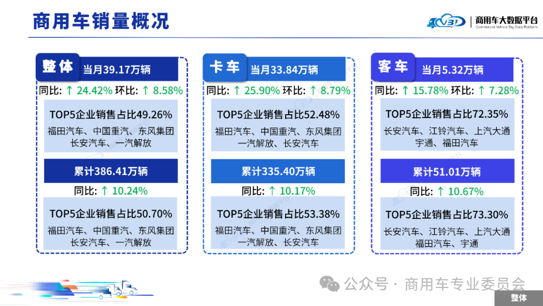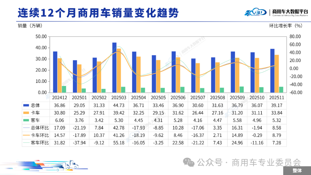 2025年11月全国商用车整体销量(批发)为39.17万辆,同比增长24.42%,环比增长8.58%;1-11月全国商用车累计整体销量(批发)为386.41万辆,累计同比增长10.24%。
