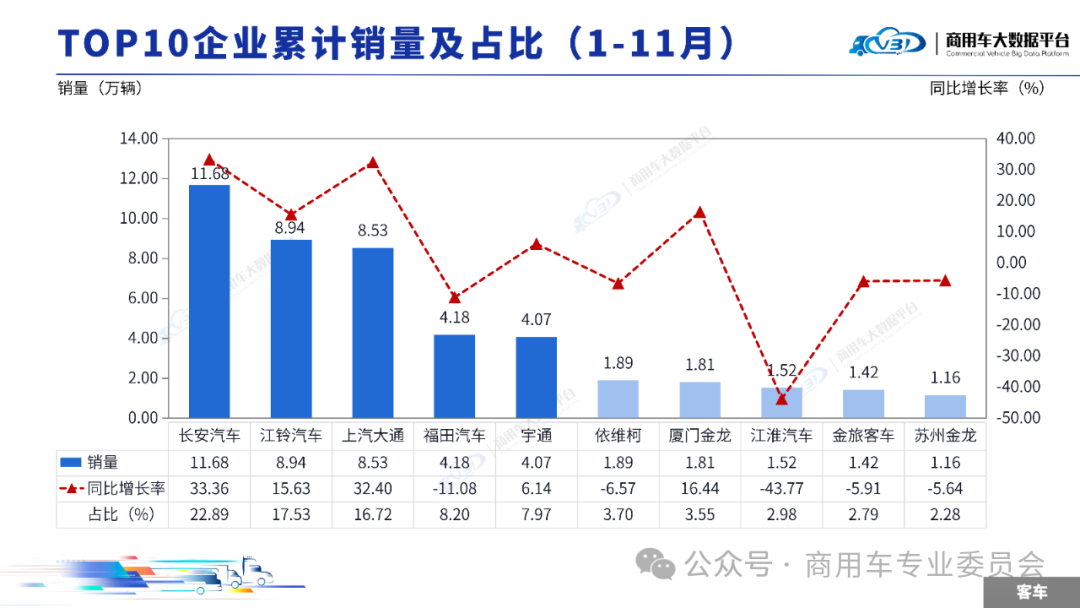 1-11月客车TOP5企业销量占比为73.30%,依次为长安汽车、江铃汽车、上汽大通、宇通、福田汽车。